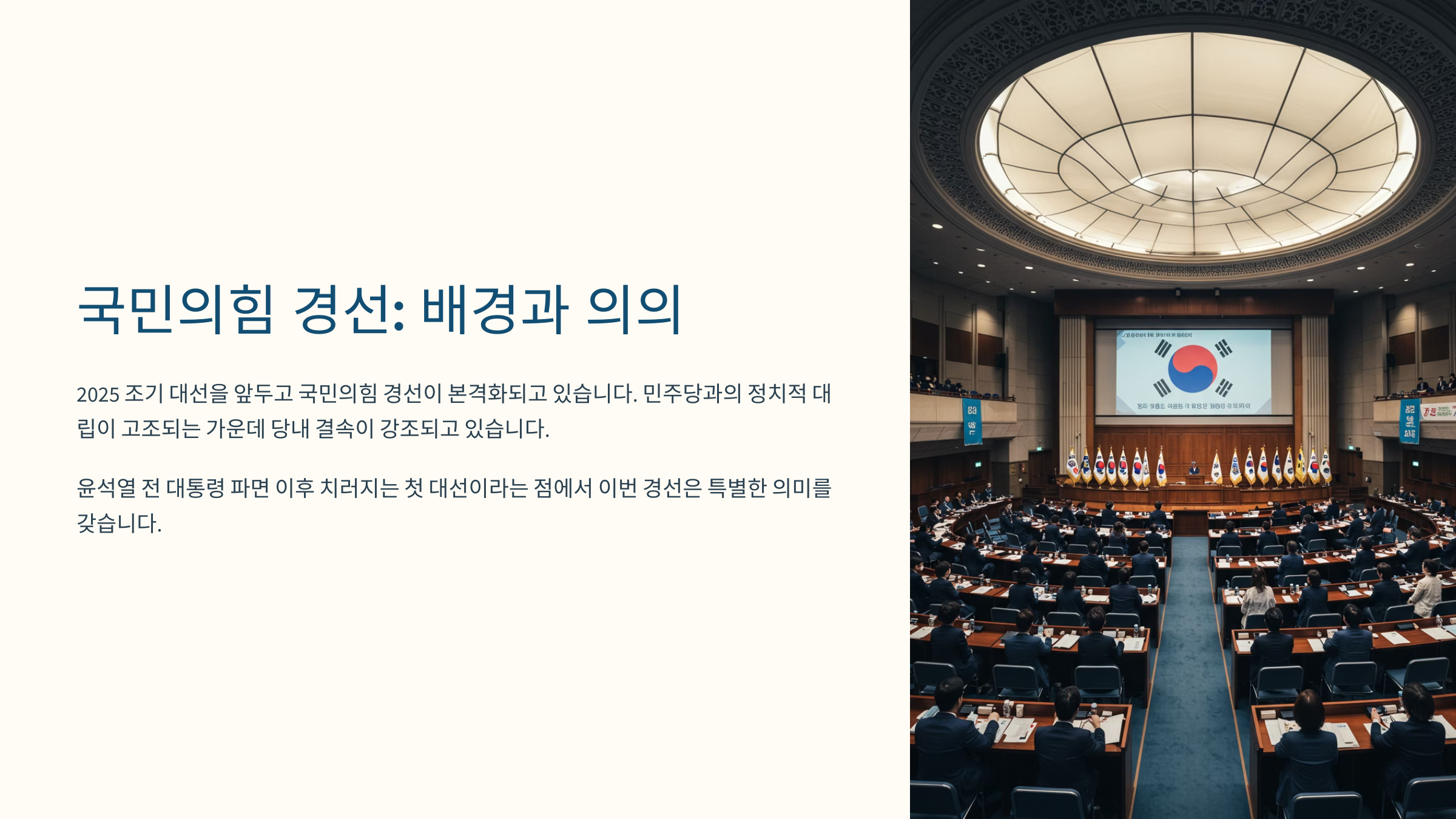 국민의 힘은 현재 집권 여당으로서 내부 개혁과 외연 확장을 동시에 꾀하고 있어요. 올해 경선은 특히 차기 대선과 연결될 가능성이 높기 때문에 주목받고 있어요.