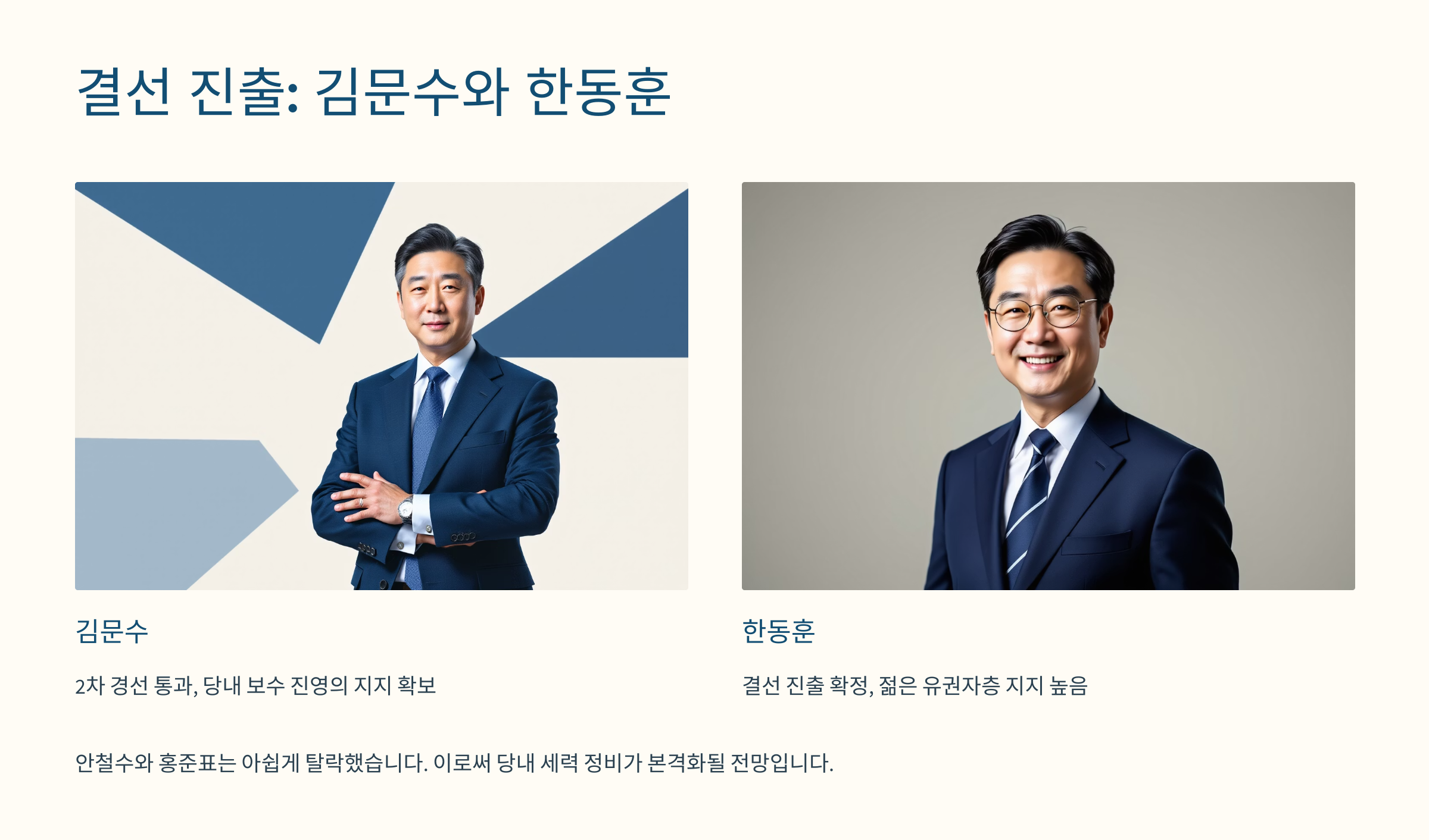2025년 4월 29일, 국민의힘 새 지도부를 뽑는 경선에서 김문수 전 경기도지사와 한동훈 전 법무부 장관이 최종 결선에 진출했어요! 🎉