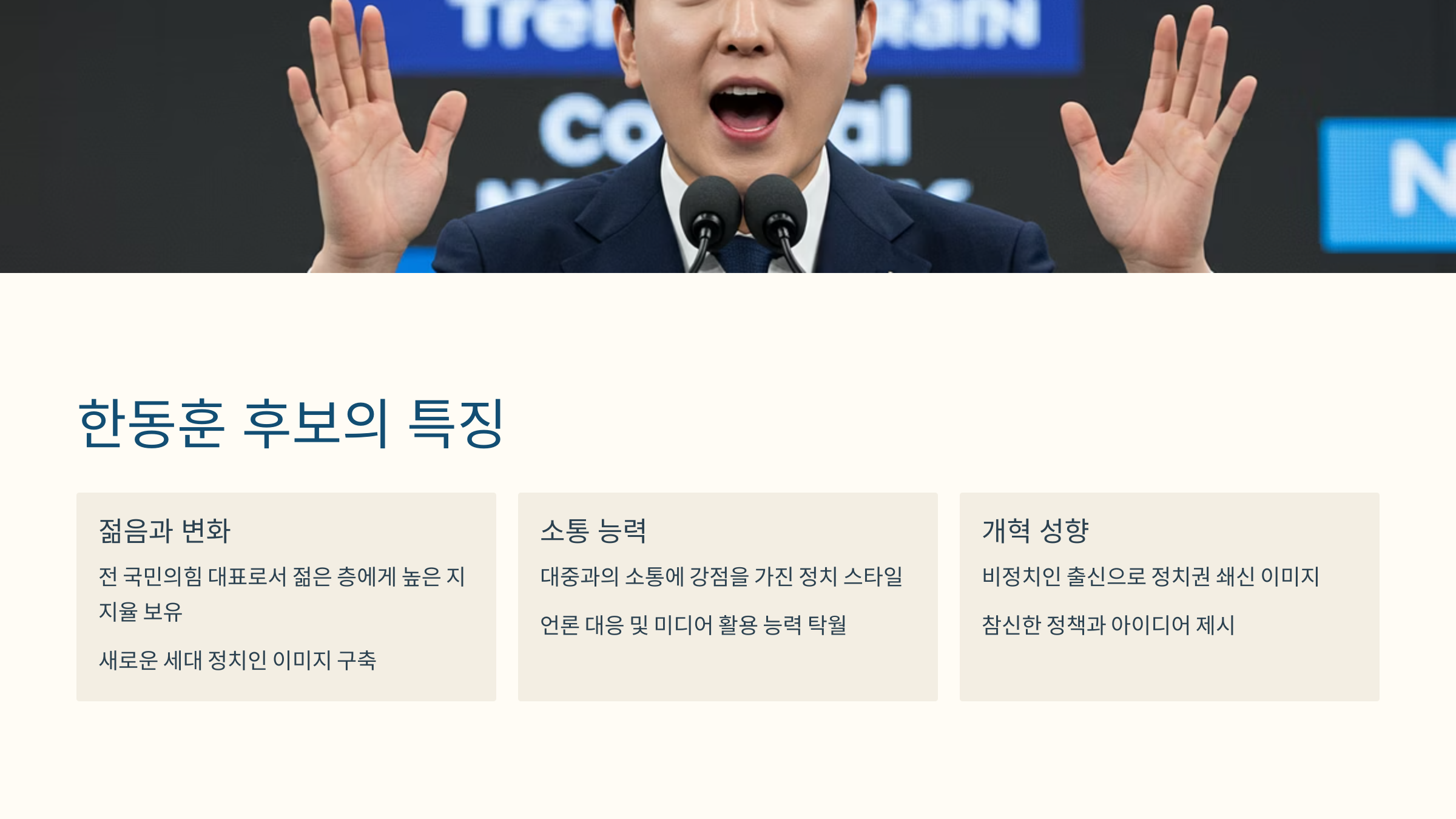 한동훈 후보는 젊은 층과 중도층을 끌어들이는 데 초점을 맞췄어요. SNS와 온라인 커뮤니티를 적극 활용해 인지도 확장에 성공하고 있죠. 🚀