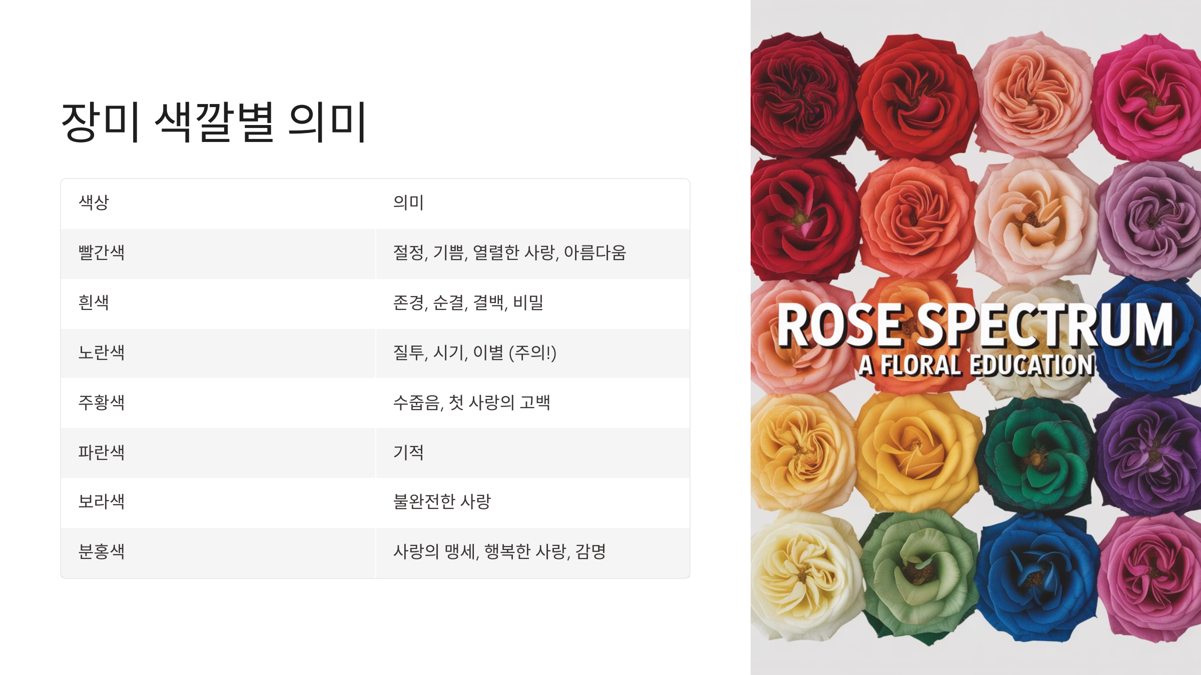 장미 색깔은 그 자체로 메시지예요. 색을 고르기 전에, 받는 사람과의 관계, 전달하고 싶은 감정, 그리고 상황을 고려해서 정한다면 훨씬 더 감동적인 선물이 될 수 있어요. '어떤 색의 장미를 줄까?'라는 고민도 로즈데이의 설렘 중 하나예요. 🌹