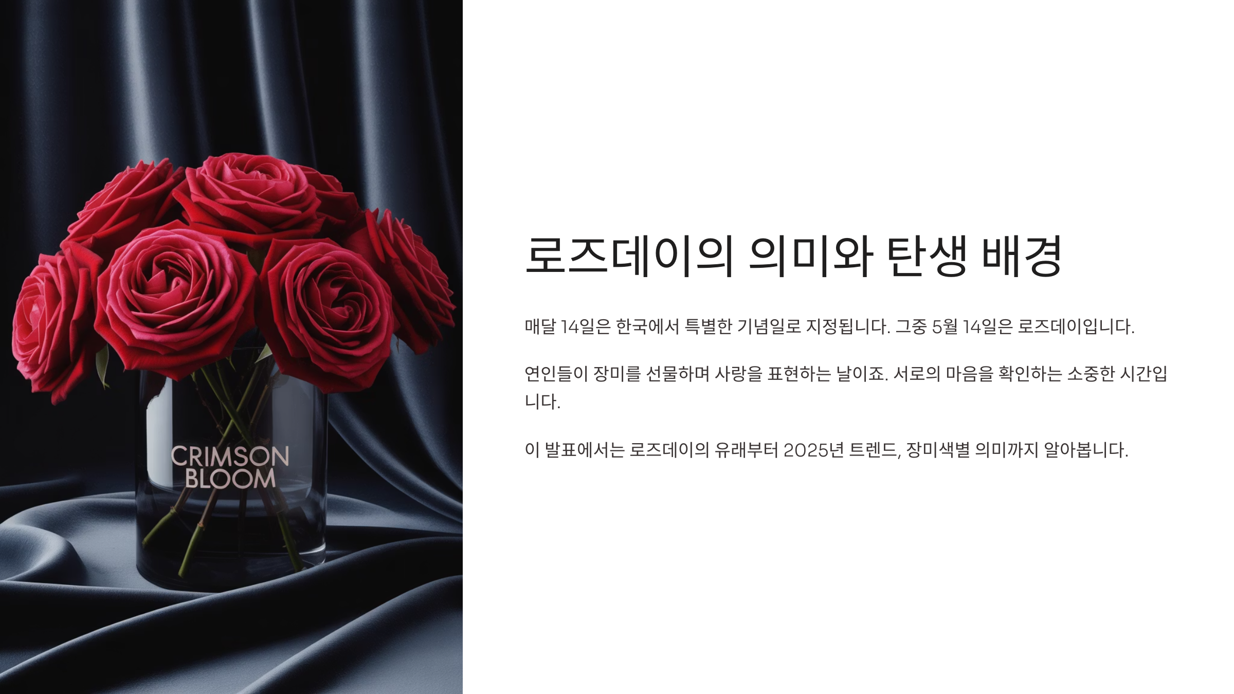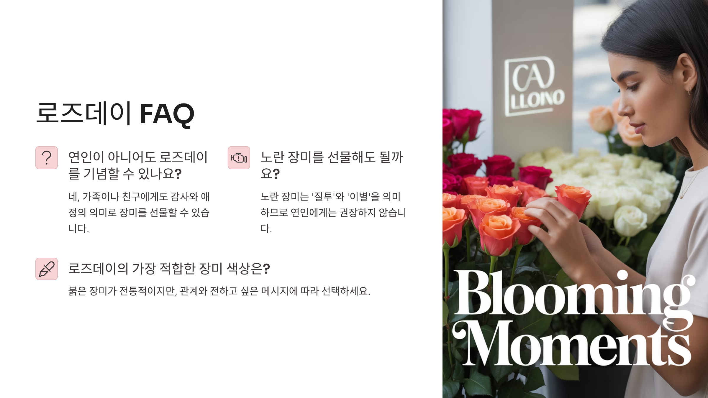 아래는 로즈데이의 탄생 배경부터 장미의 색깔별 의미, 최근 트렌드까지 재미있고 유익하게 풀어낸 콘텐츠예요. 이어서 자세히 소개할게요. 😊