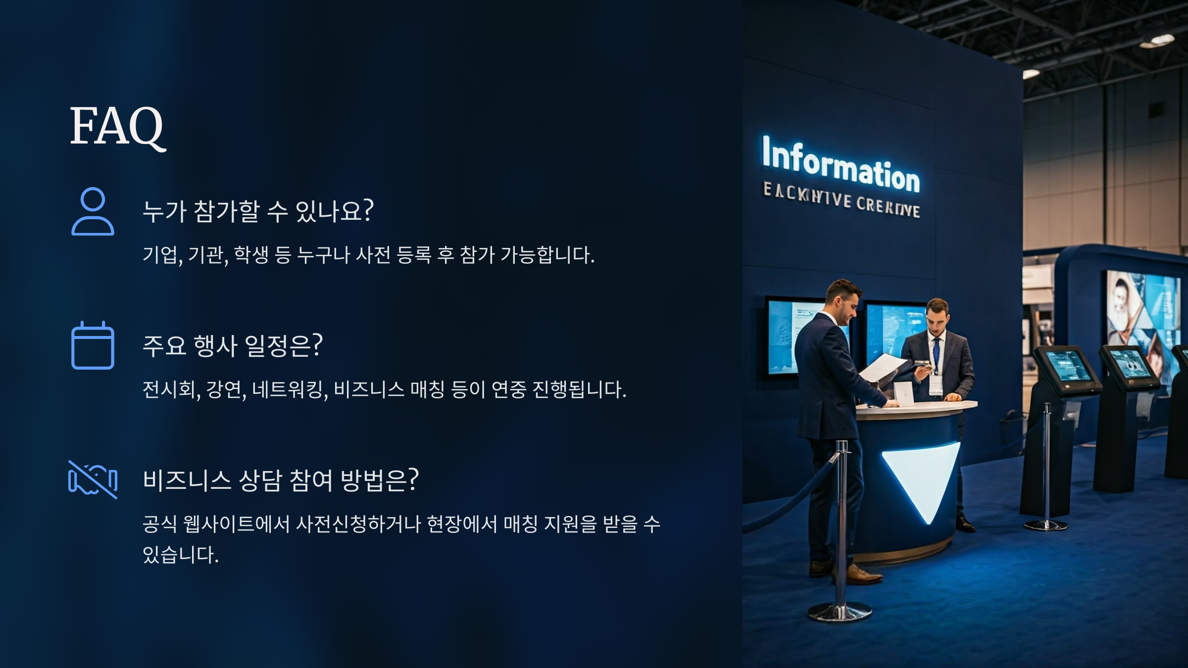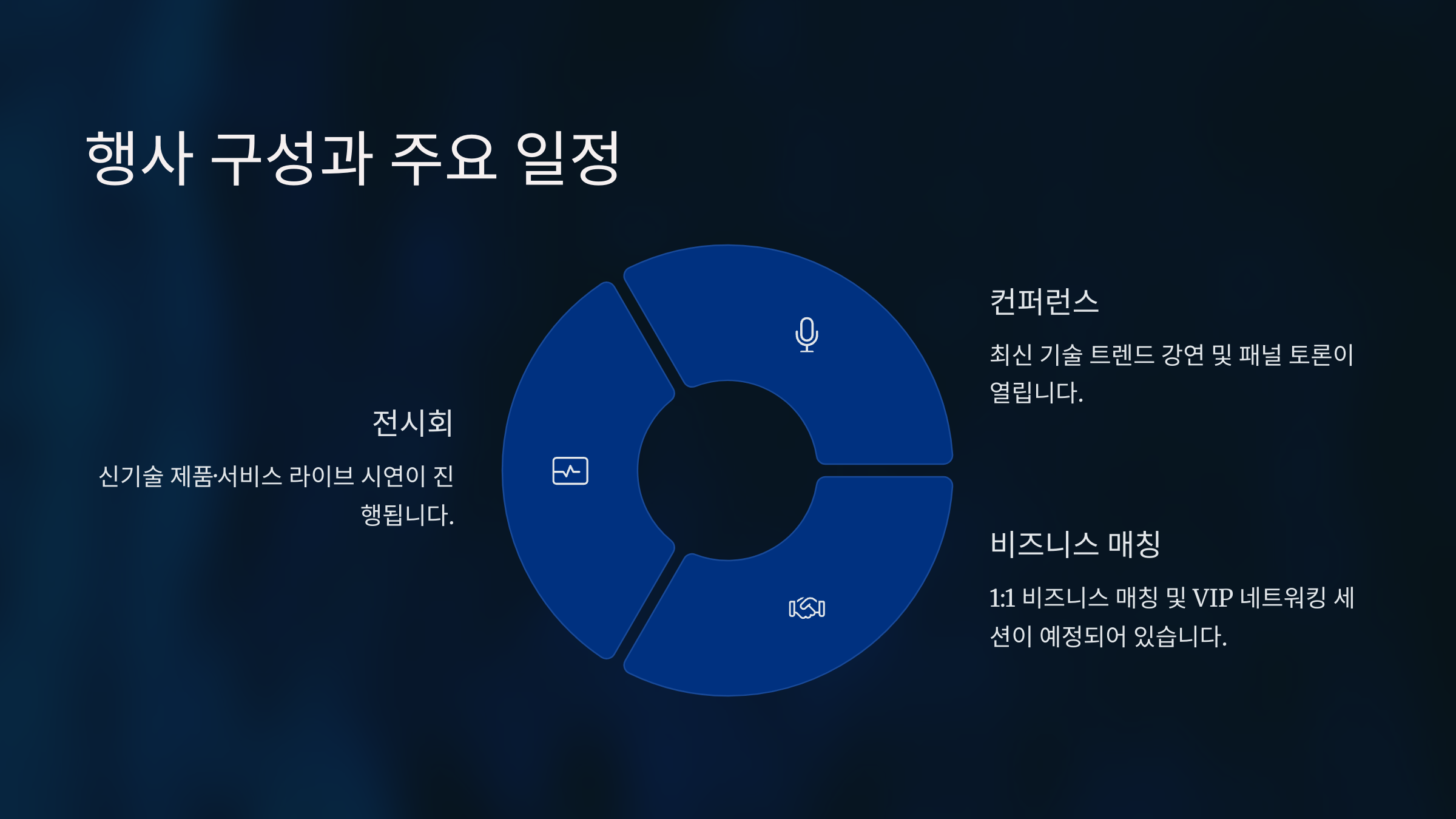 기획 단계부터 다양한 업계를 아우르는 통합 플랫폼으로 설계된 덕분에, 이 행사는 단순한 홍보장이 아니라 ‘기술 실증의 장’이라는 평가를 받아요. 전시뿐만 아니라 세미나, 포럼, 비즈니스 상담이 종합적으로 이루어지는 구조이기 때문이에요.