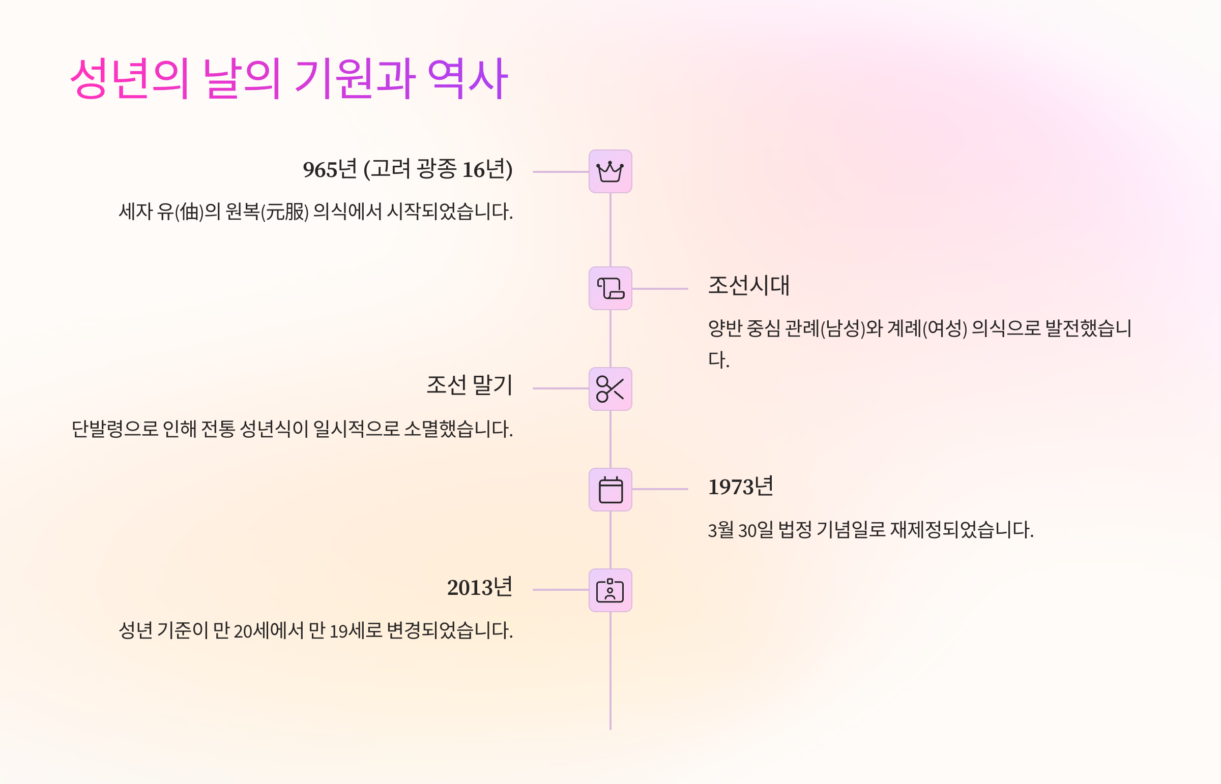그러나 조선시대 이후 근대화 과정과 함께 전통 성년의식은 점차 사라졌고, 일제강점기를 거치며 그 맥이 끊기게 되었어요. 이후 해방 후 사회 변화 속에서 젊은이들을 위한 의미 있는 기념일을 고민하게 되었고, 1973년 정부는 청년층의 자긍심과 책임감을 북돋우기 위해 성년의 날을 제정했답니다.