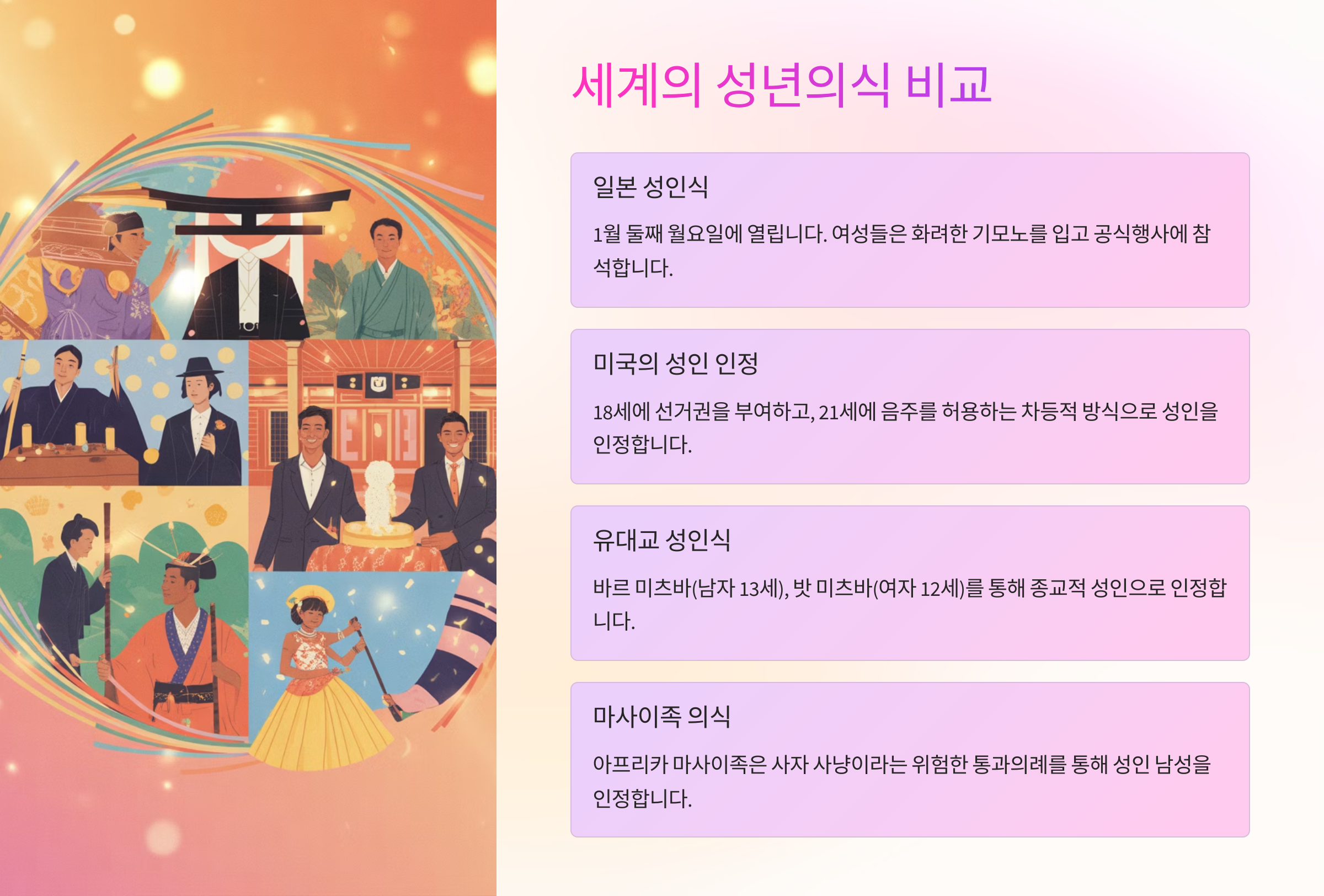 다양한 문화를 통해 우리 성년의 날도 더 깊이 있고 넓은 시각으로 바라볼 수 있어요.