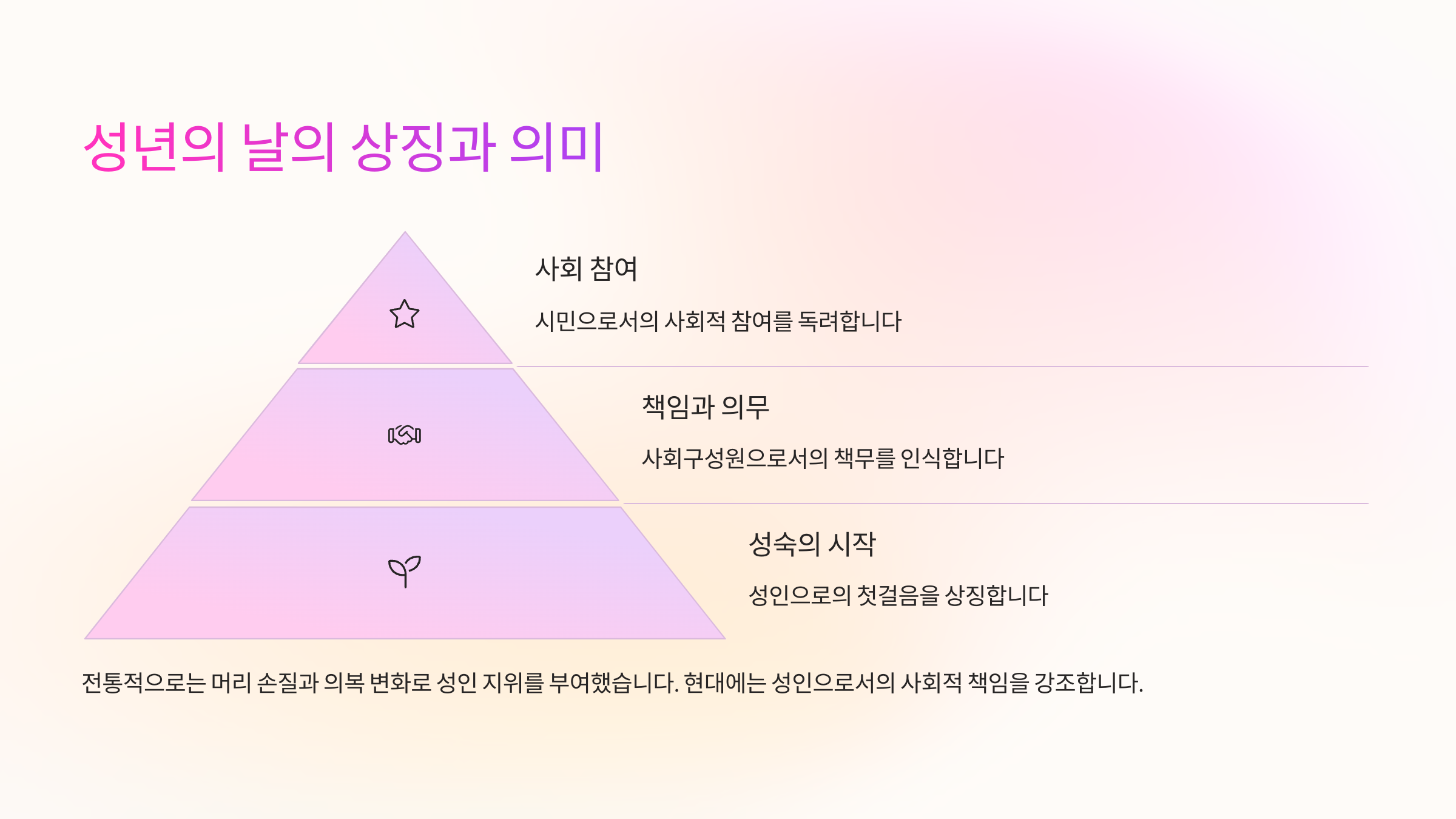 이처럼 성년의 날은 지금 이 순간에도 진화하고 있어요. 형식보다는 진심이 중요한 시대, 성인이 된다는 것은 이제 단지 사회적 지위만이 아니라 나 자신을 존중하는 의미까지 포함된다는 걸 MZ세대는 잘 보여주고 있답니다.