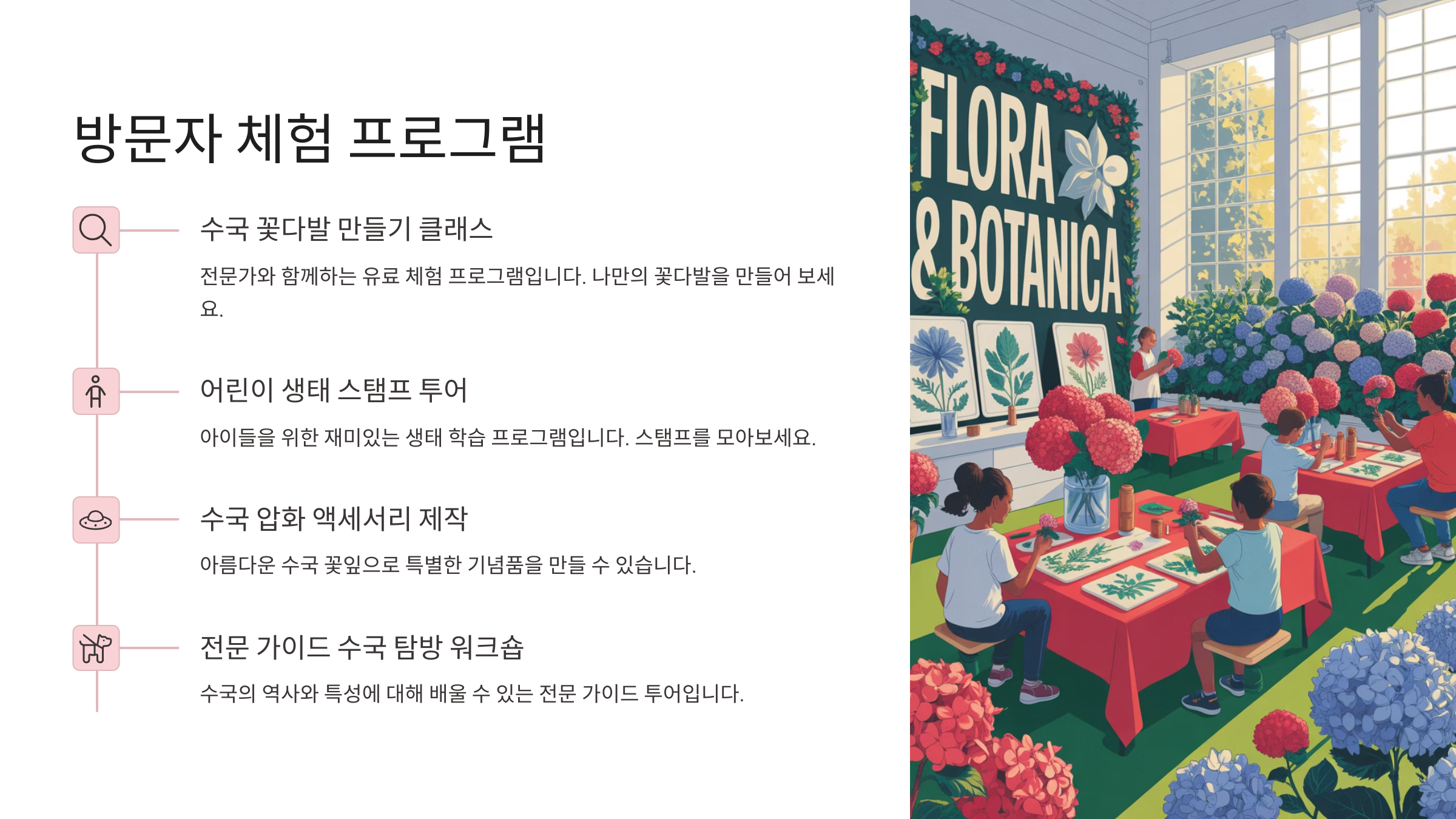 수국 전시 기간 동안에는 다양한 체험 활동도 함께 진행돼요. 대표적으로는 ‘수국 플라워 클래스’가 있는데, 이 클래스에서는 수국을 활용한 꽃다발 만들기나 압화 체험을 할 수 있어요. 미리 예약하면 더 다양한 스타일을 직접 시도해 볼 수 있답니다.
