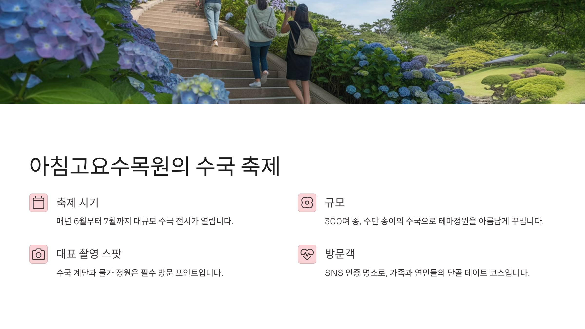 2025년에도 아침고요수목원은 더욱 풍성하고 예술적인 수국 테마 정원으로 돌아왔어요. 이 글에서는 수국의 역사부터 꽃말, 수목원의 축제 구성까지 자세히 소개해 드릴게요. 내가 생각했을 때, 이번 해의 테마는 사진 찍기 좋아하는 분들에게 정말 딱이에요📸
