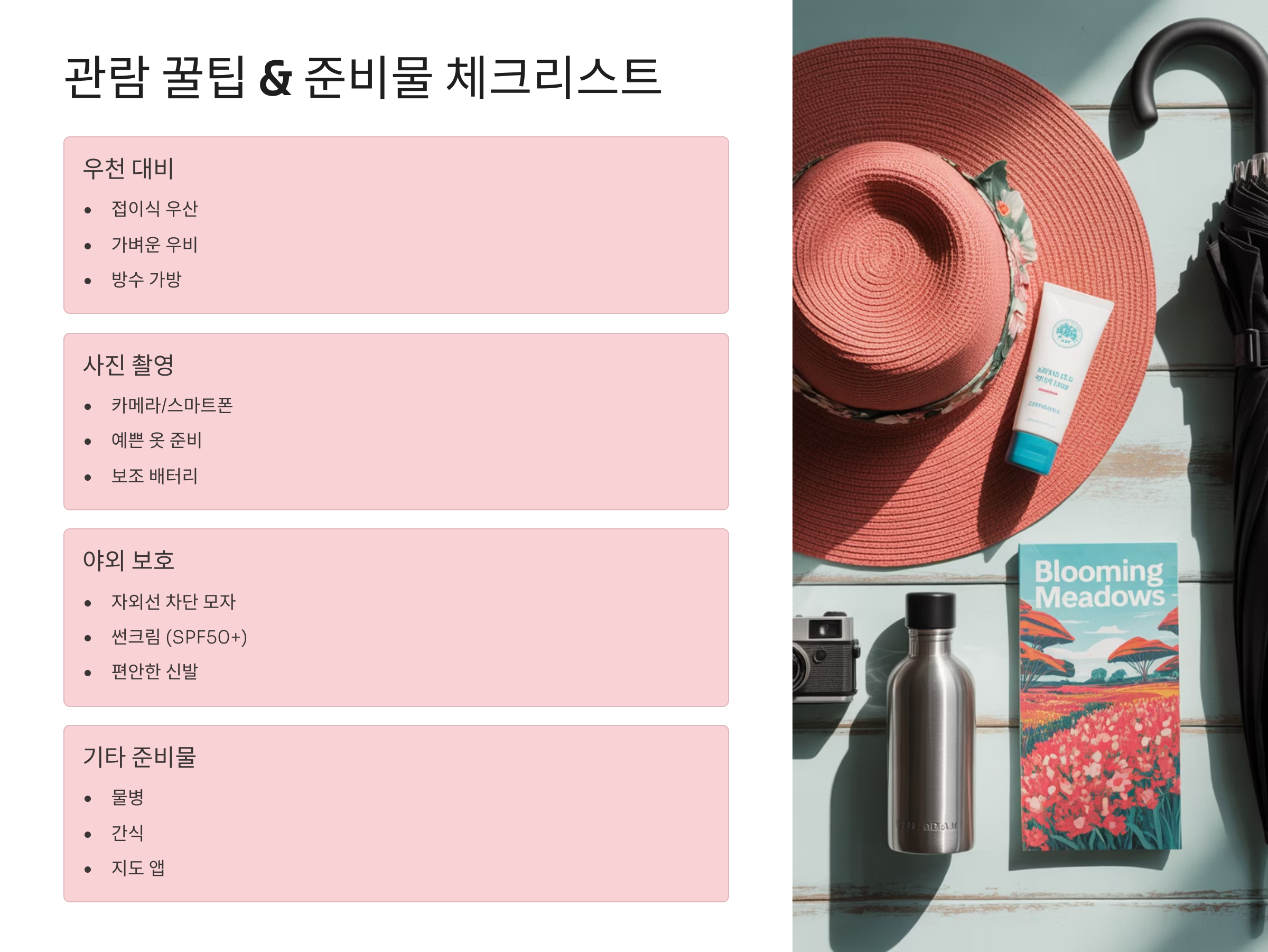 햇볕이 강한 낮 시간에는 챙 넓은 모자와 선크림이 필수예요. 그리고 산책로를 따라 걷는 시간이 길기 때문에 편한 운동화나 샌들을 추천해요. 카메라는 충전된 배터리와 함께 꼭 챙겨 오세요! 📸