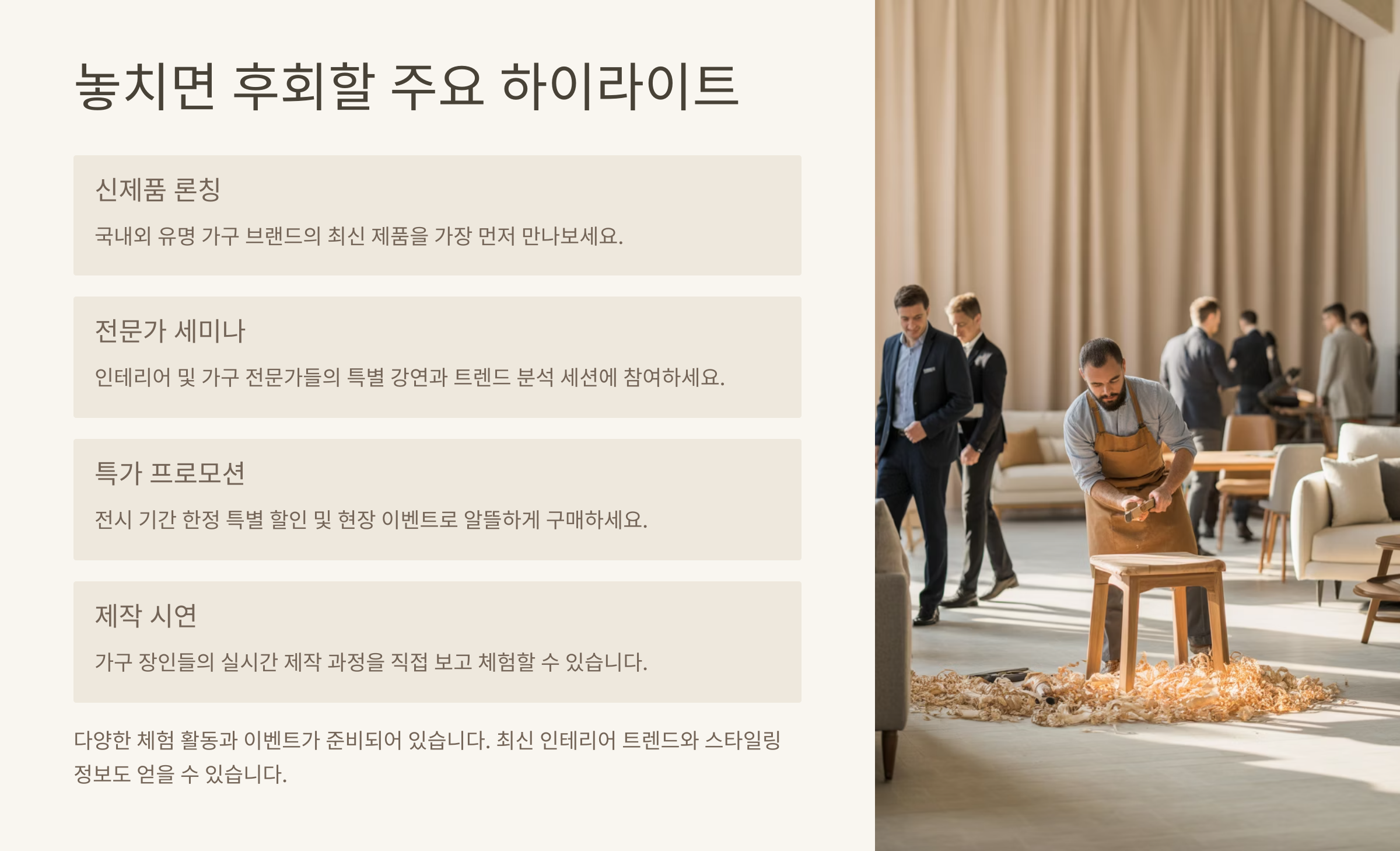 올해 동아 가구엑스포에서는 특별한 프로그램이 준비되어 있어요. 그중에서도 '1:1 인테리어 상담존'과 '디자이너 초청 세미나'는 꼭 참여해보는 걸 추천해요. 전문가의 인사이트를 가까이서 들을 수 있답니다!