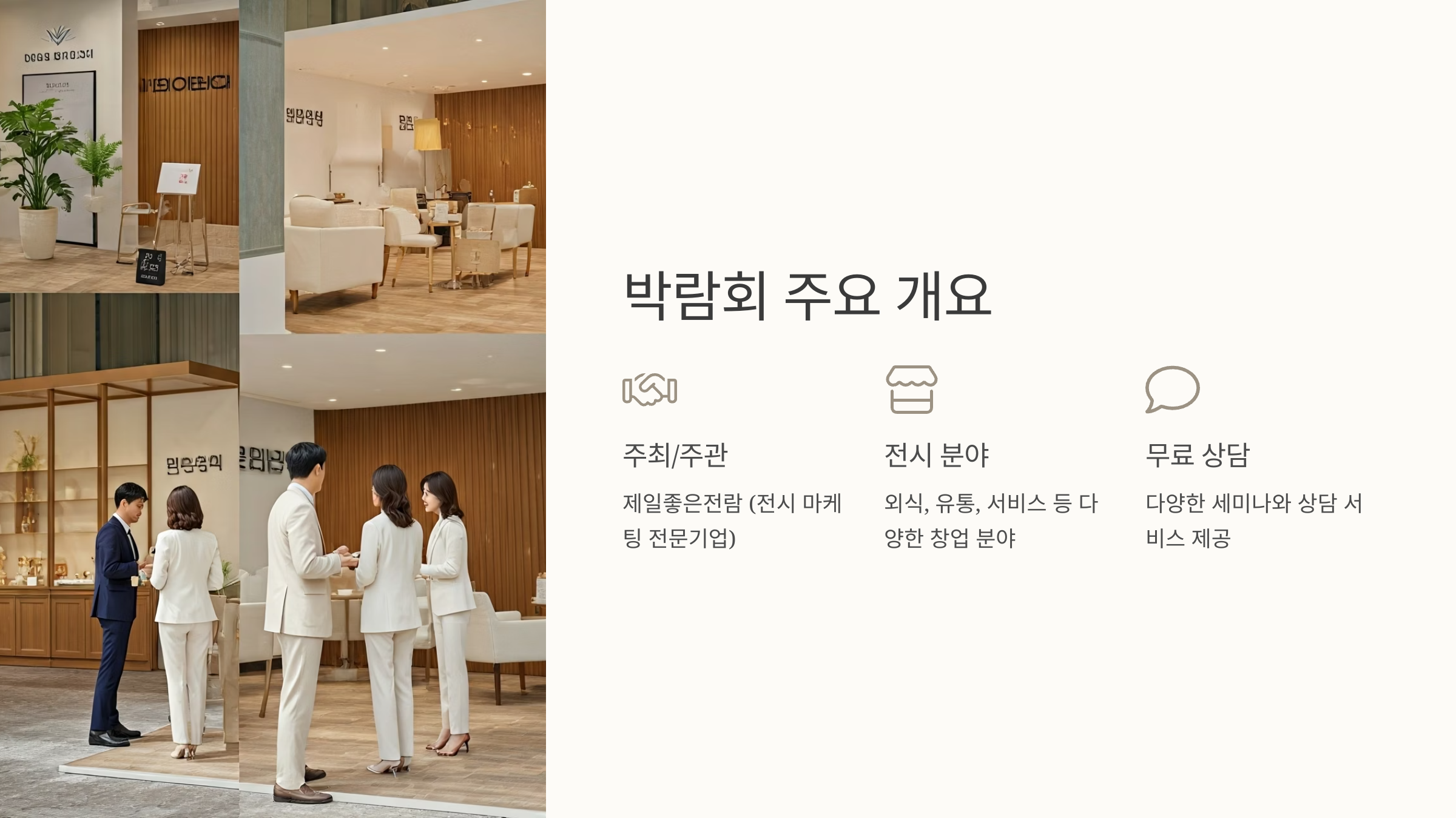 가장 흥미로운 점은 박람회에 참가하면 '1:1 창업 컨설팅'을 무료로 받을 수 있다는 거예요. 전문 창업 컨설턴트가 현장에서 대기하고 있어서, 본인의 자본, 성향, 지역에 맞는 아이템을 함께 탐색해줘요.