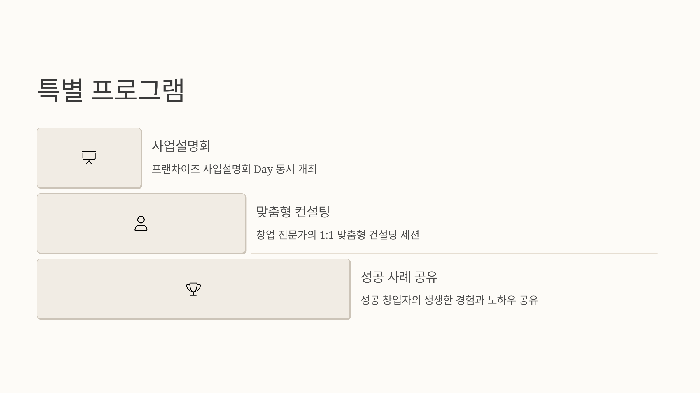 지난 회차들을 돌아보면, 카페·음식점·편의점·교육·서비스 등 거의 모든 산업군이 참여한 걸 볼 수 있어요. 그야말로 창업 트렌드의 축소판이라고 해도 과언이 아니에요.