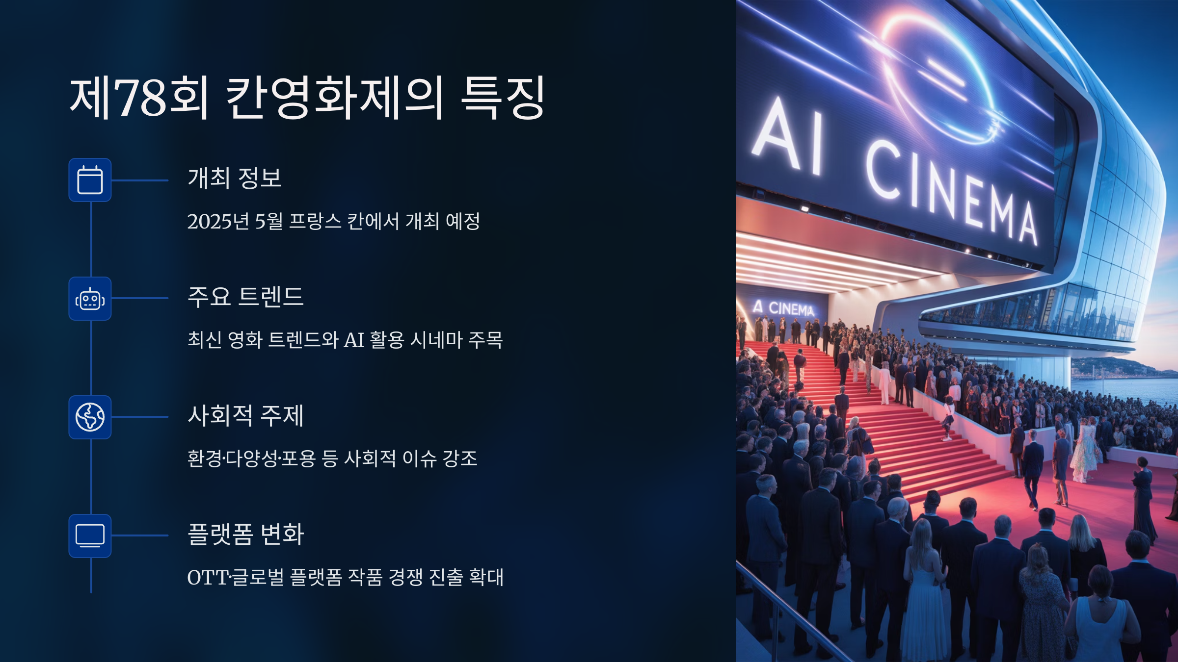 그리고 또 하나, 2025년에는 **AI 기술이 접목된 단편 영화**가 최초로 칸영화제에 소개됐어요. 이 영화는 감독과 AI의 협업으로 제작되었으며, 서사적 구성과 영상미에서 신선한 충격을 줬어요. 새로운 기술과 예술의 만남은 앞으로의 영화제 흐름에 커다란 영향을 미칠 것으로 보여요.