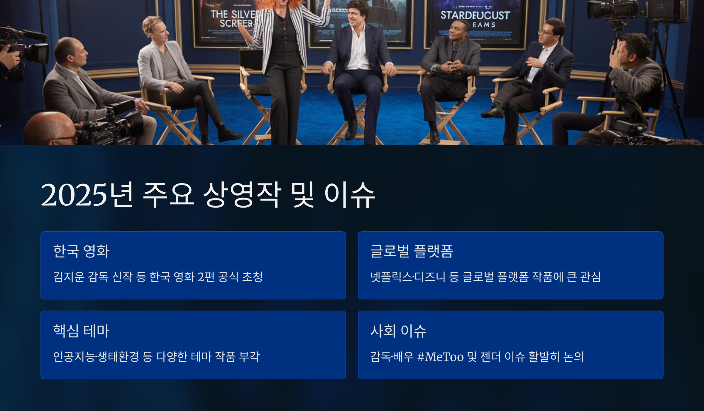 2025년 심사위원단은 9명으로 구성됐고, 각국의 영화감독, 배우, 작가, 영화평론가들이 참여했어요. 심사위원장은 배우이자 감독인 마틸다 윌리엄스로, 그녀는 인터뷰에서 "영화는 시대를 반영하는 거울이자, 우리가 나아갈 방향을 제시해야 한다"라고 말했답니다. 🎤