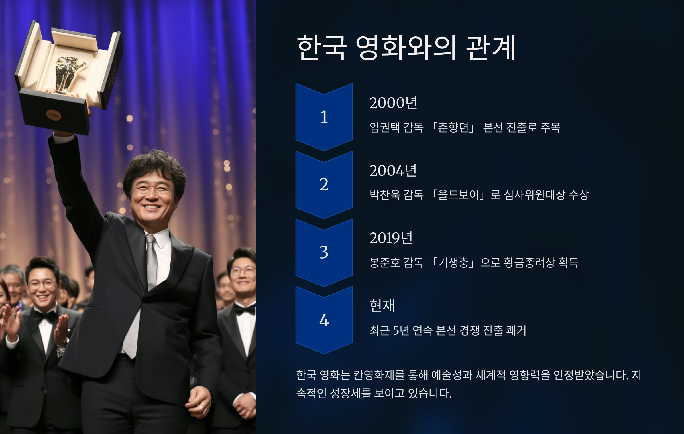 2004년 박찬욱 감독의 올드보이가 심사위원대상을 수상하며 전 세계에 '코리안 누아르'라는 말을 각인시켰고, 이후 2019년에는 봉준호 감독의 기생충이 황금종려상을 수상하며 칸을 넘어서 세계 영화사에 길이 남을 기록을 세웠답니다. 그해 기생충은 아카데미 작품상까지 수상했죠. 🍾