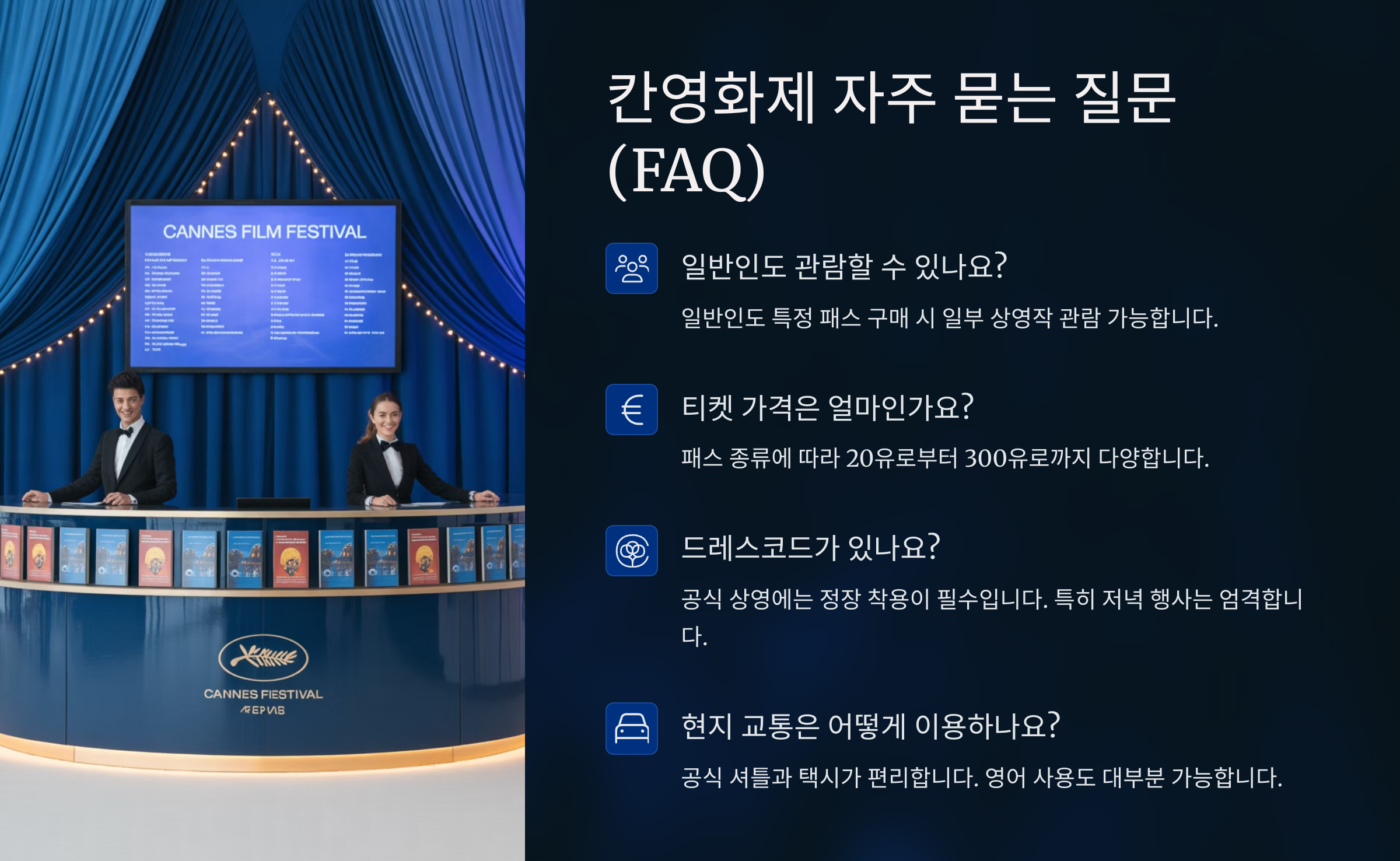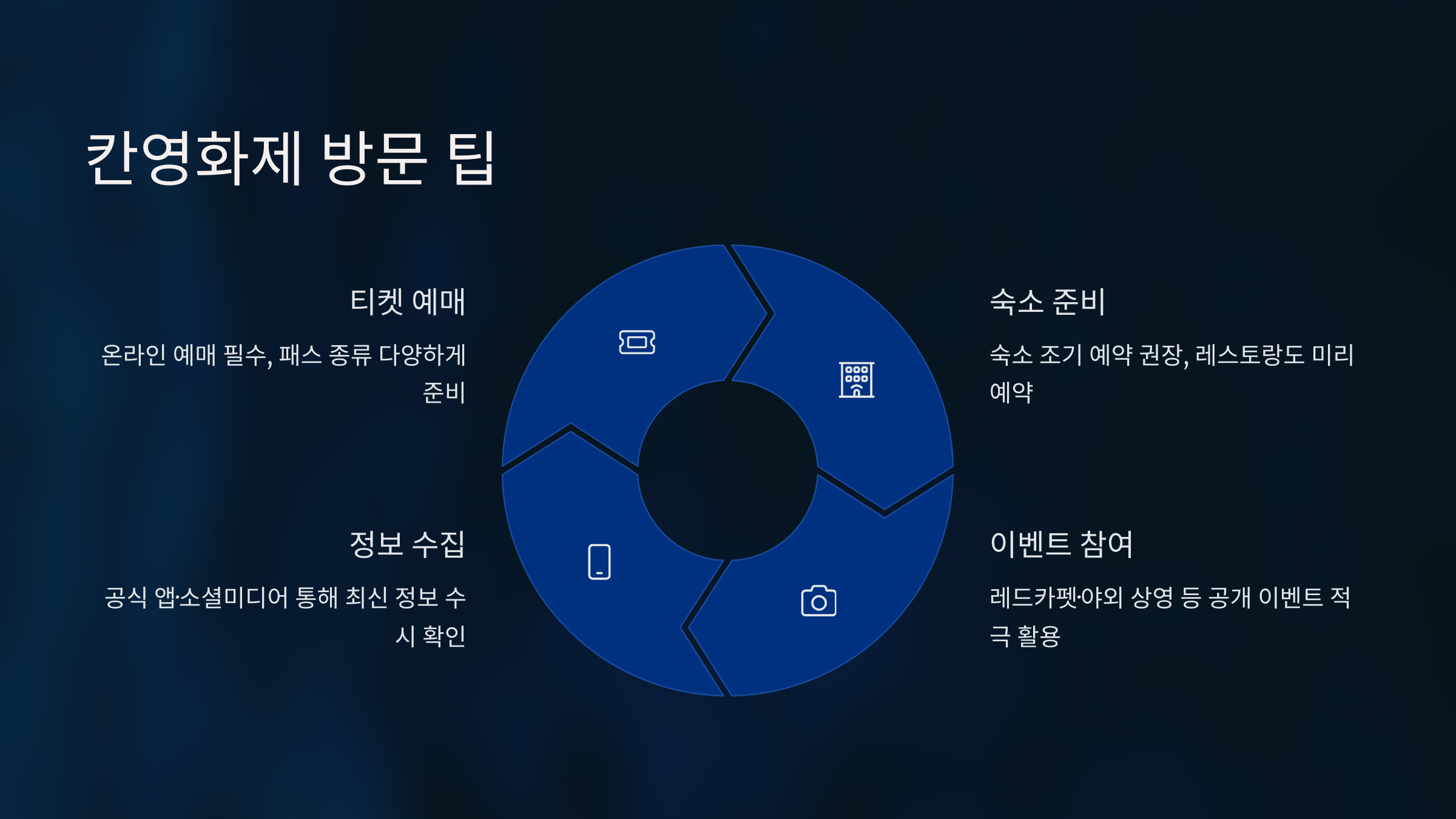 칸영화제는 누구나 방문할 수 있는 공개 영화제가 아니에요. 대부분의 상영은 초청자나 영화 관계자 대상이지만, 일반 관람객도 사전에 준비하면 영화제 현장을 충분히 즐길 수 있답니다. 특히 3월~4월 사이에 온라인 사전 등록을 통해 일반 관람 신청을 할 수 있어요. 🎫