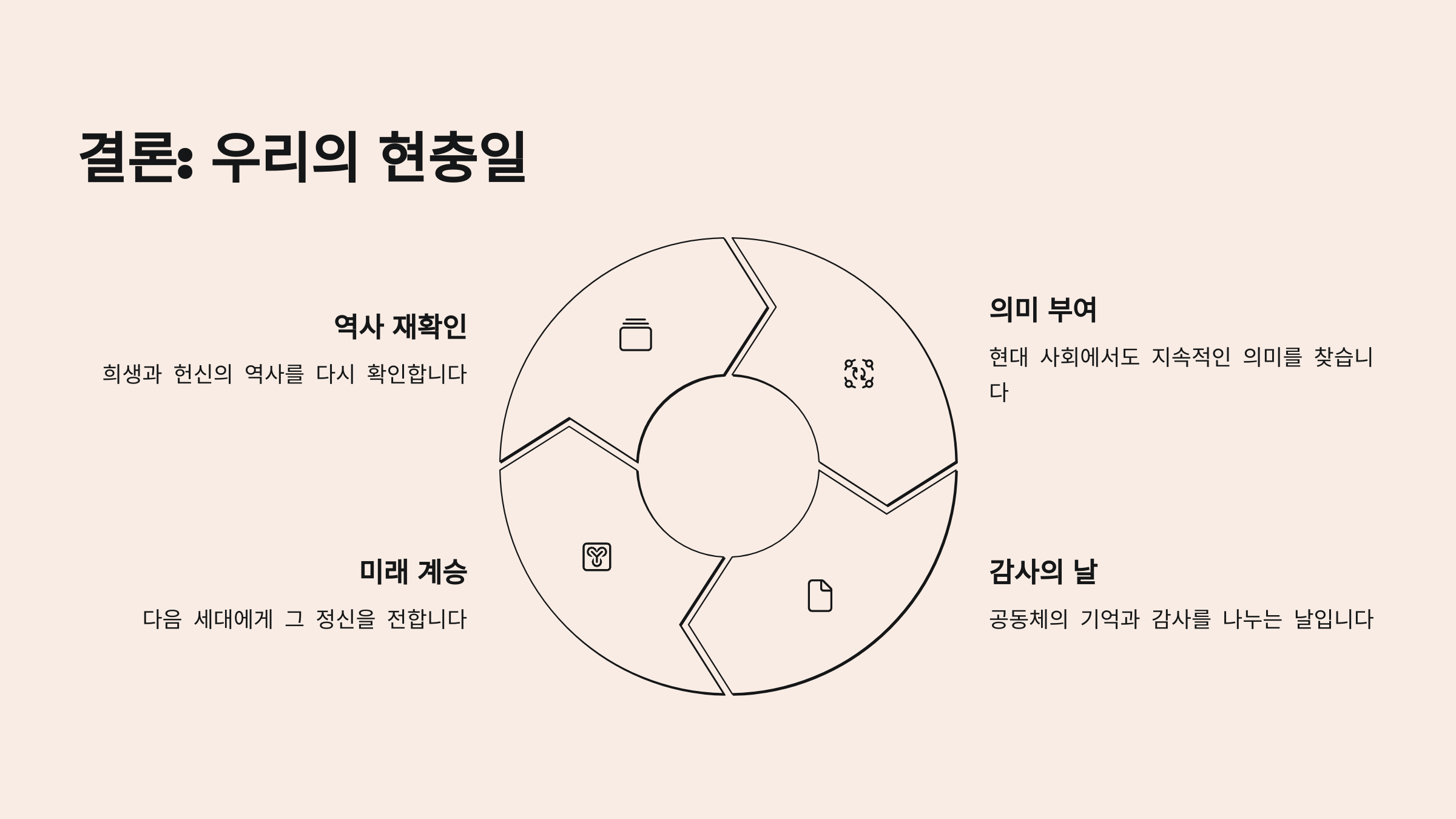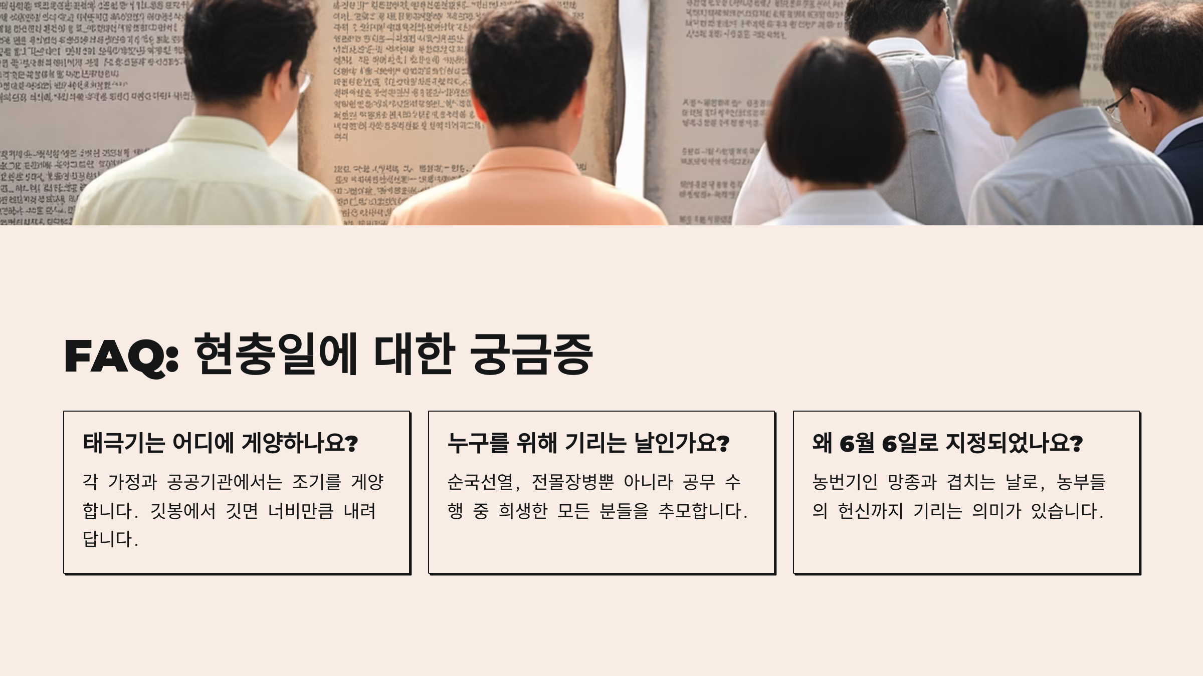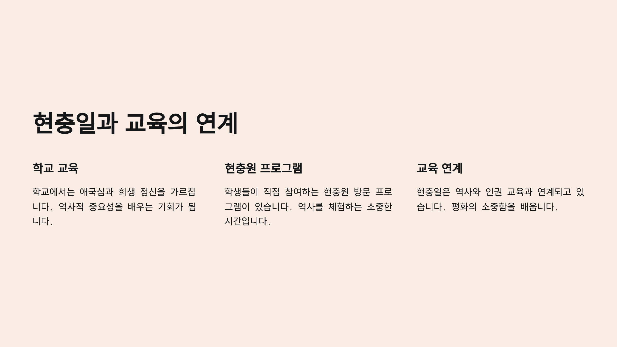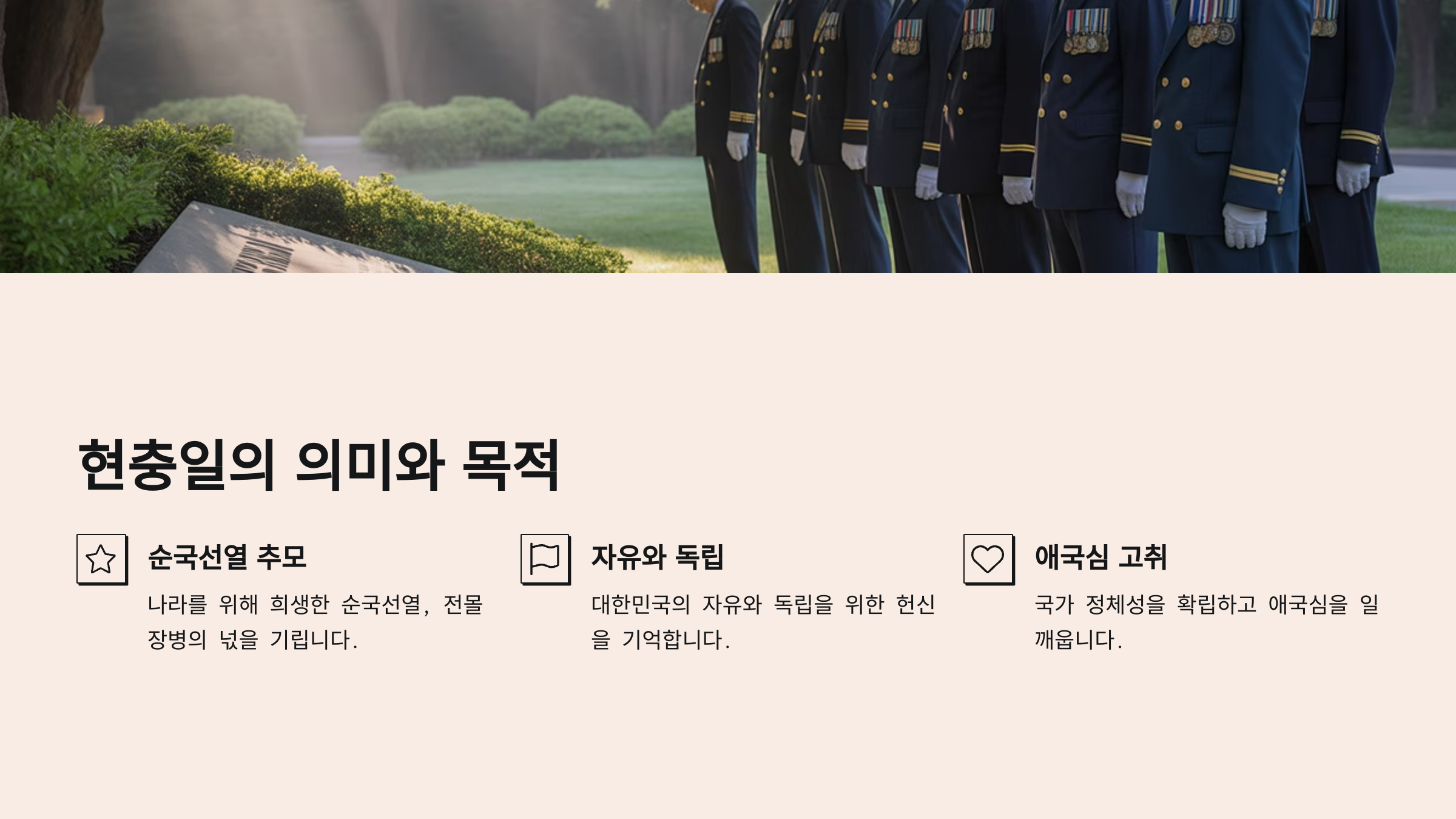이처럼 교육과 현충일은 매우 긴밀하게 연결돼 있어요. 지금 배우는 학생들이 훗날 사회의 주역이 될 때, 그들이 기억하는 현충일의 의미가 우리 사회를 더 단단하게 만들 수 있겠죠.