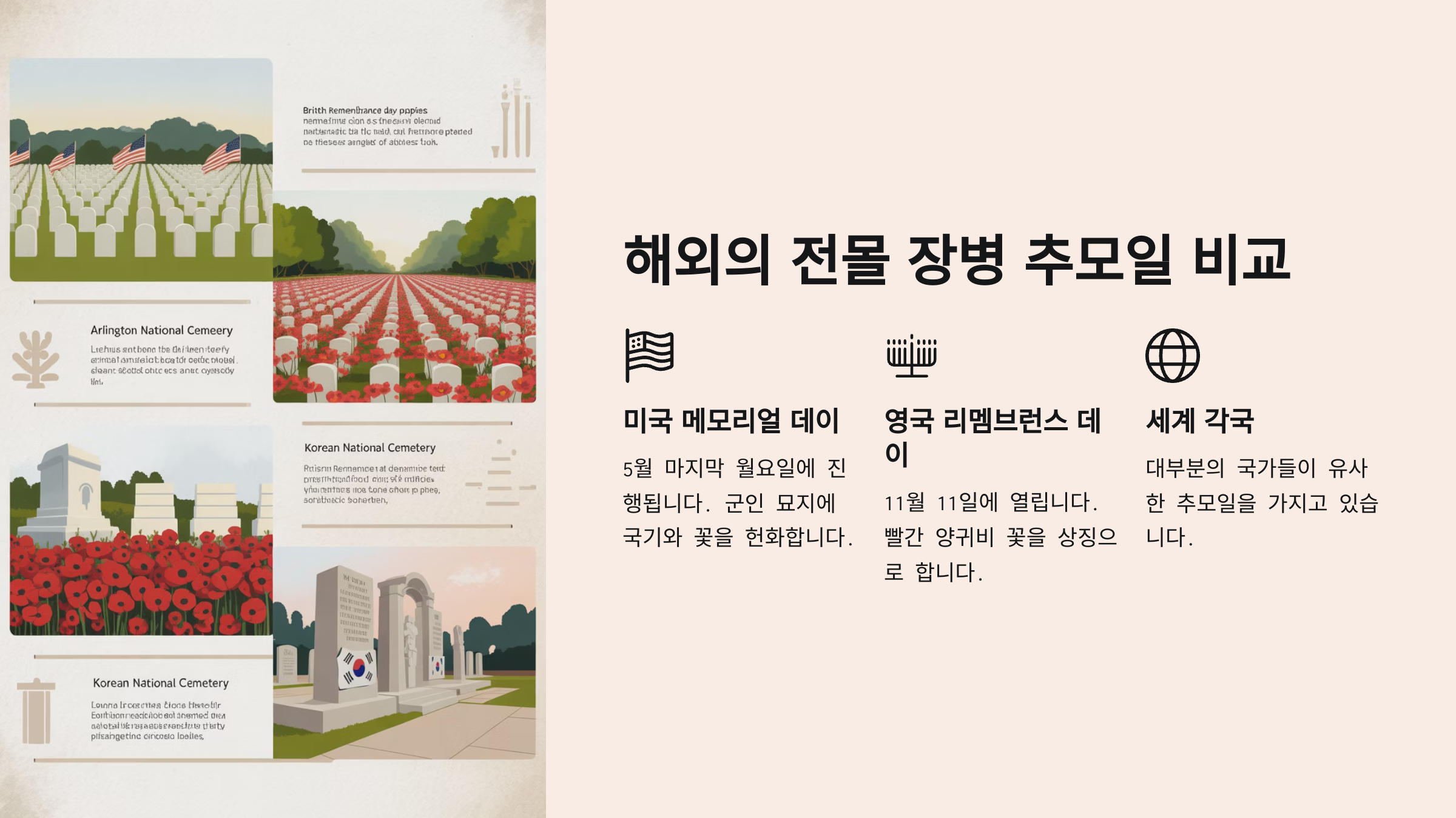 세계 각국도 전몰자 추모에 큰 가치를 두고 있으며, 우리와 비슷한 방법으로 그 뜻을 기리고 있어요. 이렇게 비교해 보면, 현충일은 세계적인 공감과 연결된 문화라는 사실도 느낄 수 있어요.