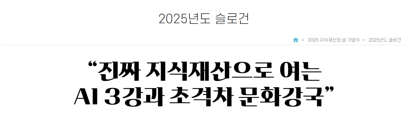 2025년 제8회 지식재산의 날 슬로건은 “진짜 지식재산으로 여는 AI 3강과 초격차 문화강국”이에요. 이는 단순히 지식재산 보호를 넘어, 이를 활용하여 글로벌 기술과 문화 경쟁에서 우위를 차지하자는 메시지를 담고 있어요.