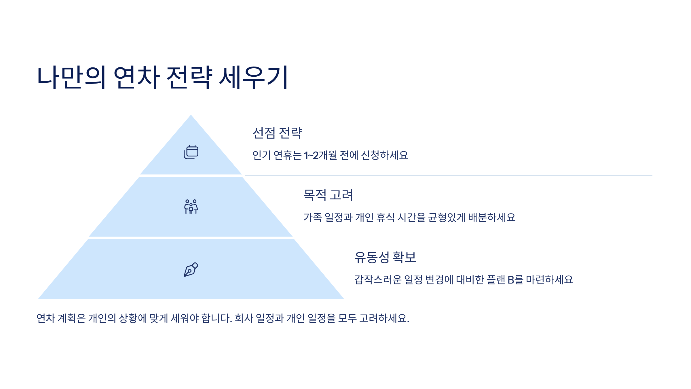또한 부모님 모시는 가정이나 자녀 돌봄이 필요한 가정은 가족 행사를 연계한 연차가 좋아요. 반면 솔로 라이프를 즐기고 있는 분들은 혼자만의 여행, 취미활동 위주의 연차 플랜이 더 만족도가 높을 수 있어요.