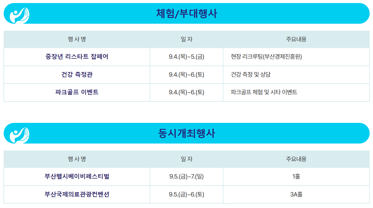 다양한 부대행사도 전시회 기간 동안 함께 진행돼요. 대표적으로 중장년 리스타트 잡페어, 실내 파크골프 이벤트존, 건강 측정 체험존 등이 있어요. 관람객들의 흥미와 참여를 높이기 위한 기획이 인상적이죠.