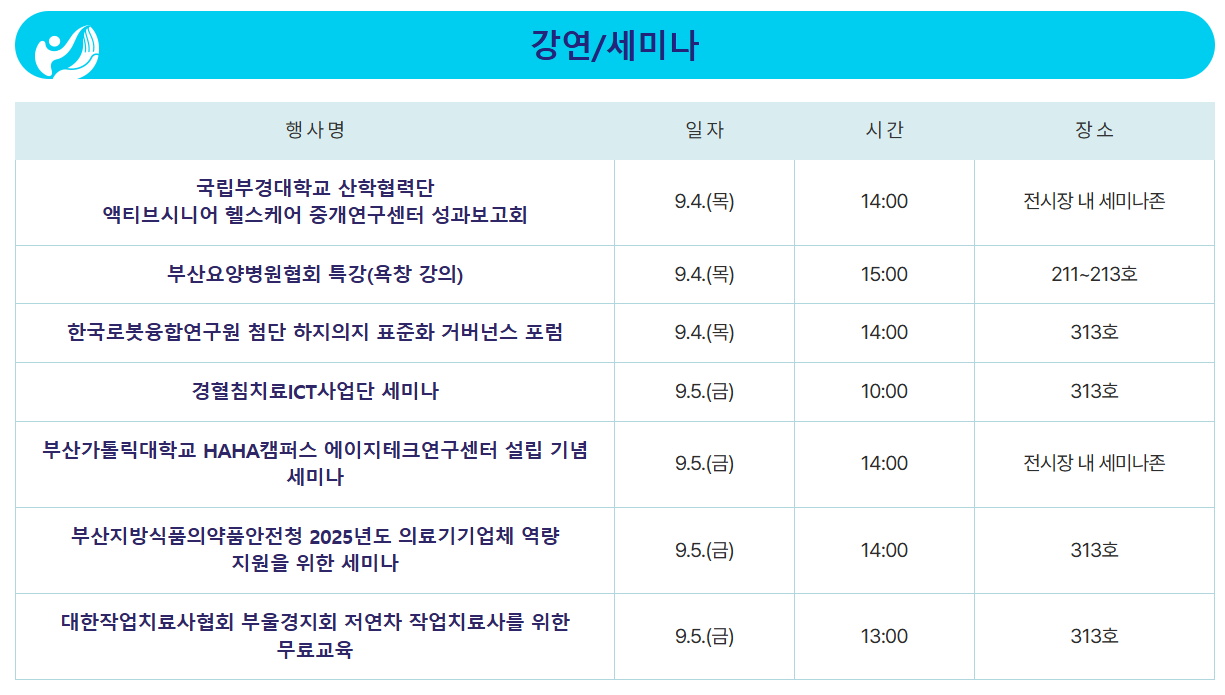 세미나와 강연도 풍성하게 준비되어 있어요. 한국로봇융합연구원, 국립부경대 산학협력단, 부산가톨릭대학교 HAHA센터 등에서 의료, ICT, 작업치료 등 다양한 주제로 강의를 열어요.