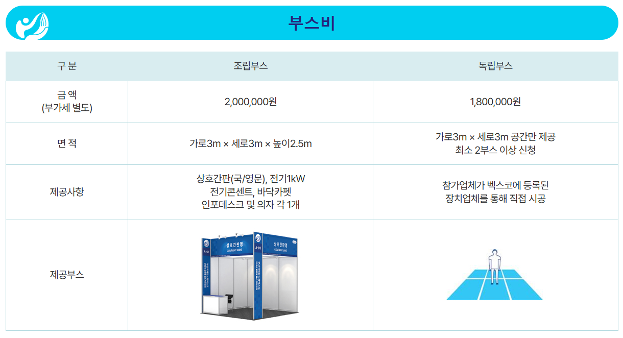 독립부스는 공간만 제공되며, 최소 2부스 이상 신청해야 하고 참가 기업이 직접 시공해요. 벡스코에 등록된 장치업체를 통해 공사를 진행해야 하며, 원하는 디자인으로 커스터마이징이 가능해요.