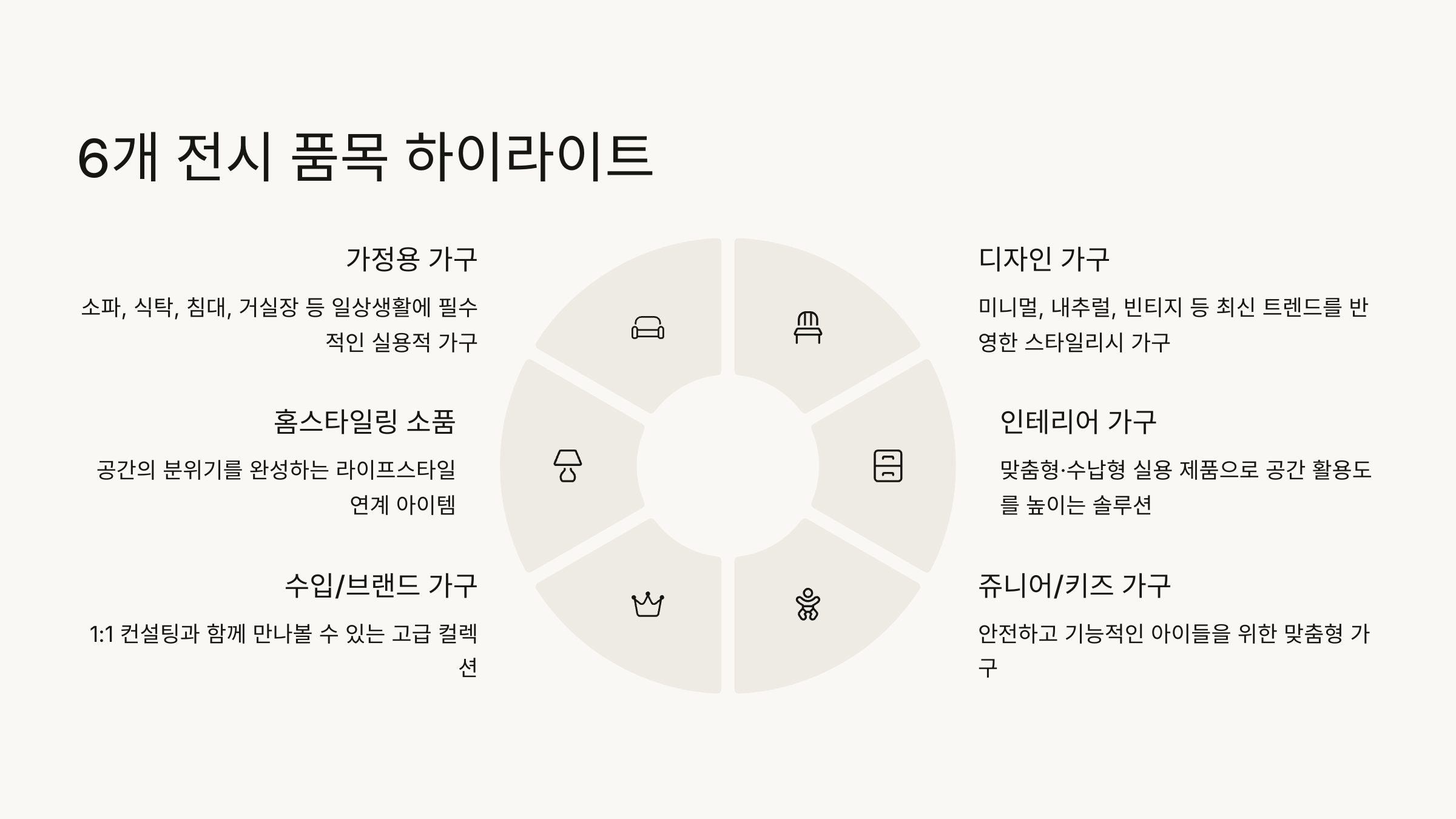 | TOTAL LIVING | 가구, 조명 등 공간별 생활 제품 | 소파, 테이블, 스마트 조명 |