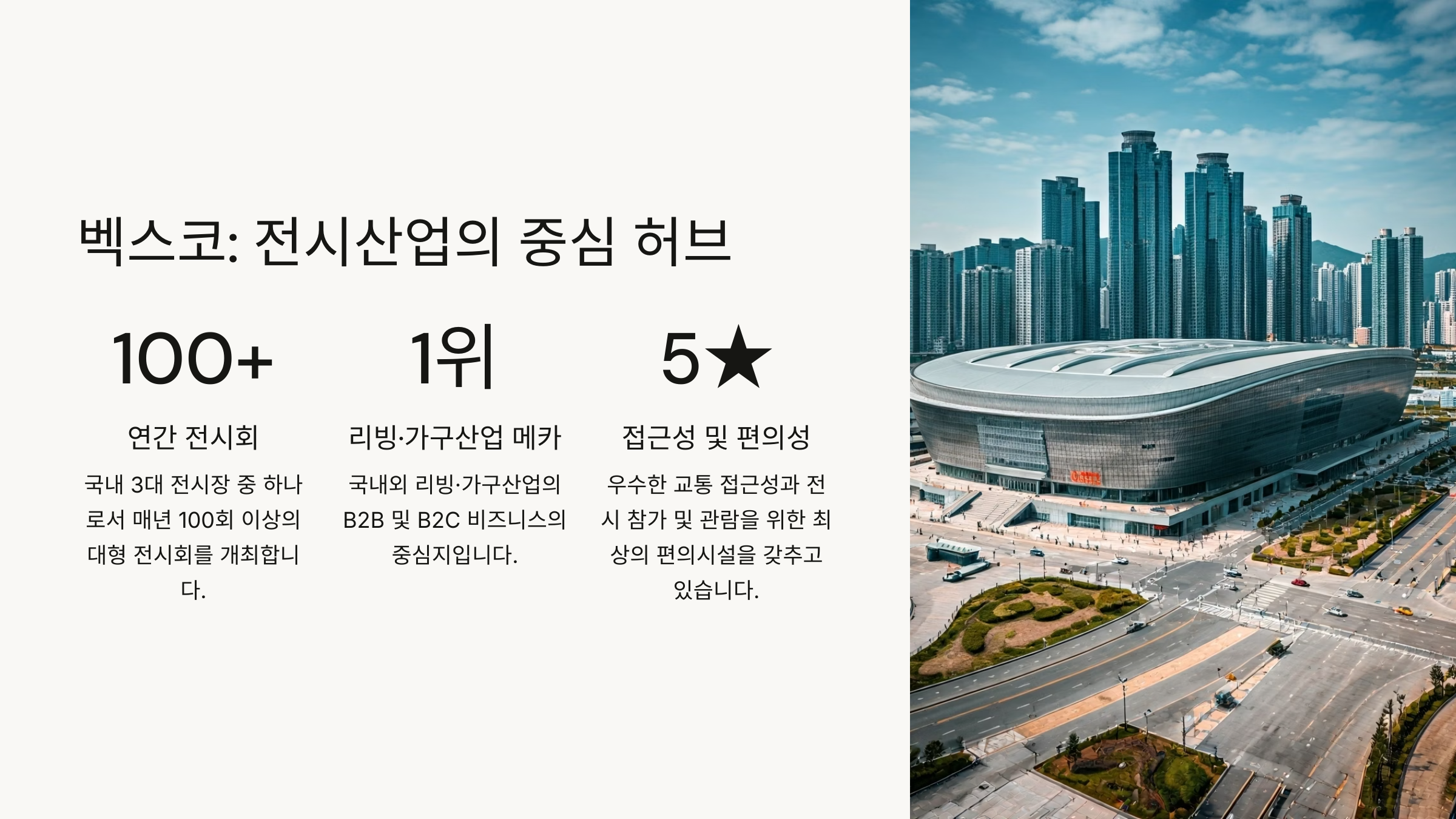 부산 벡스코는 남부권 최대 규모의 전시·컨벤션 센터로, 매년 수많은 국내외 전시회와 박람회가 열리는 곳이에요. 홈·테이블데코페어를 포함해 커피쇼, 아트페어, 게임 전시 등 다양한 분야를 아우르며 부산을 전시도시로 자리 잡게 만든 핵심 거점이랍니다.