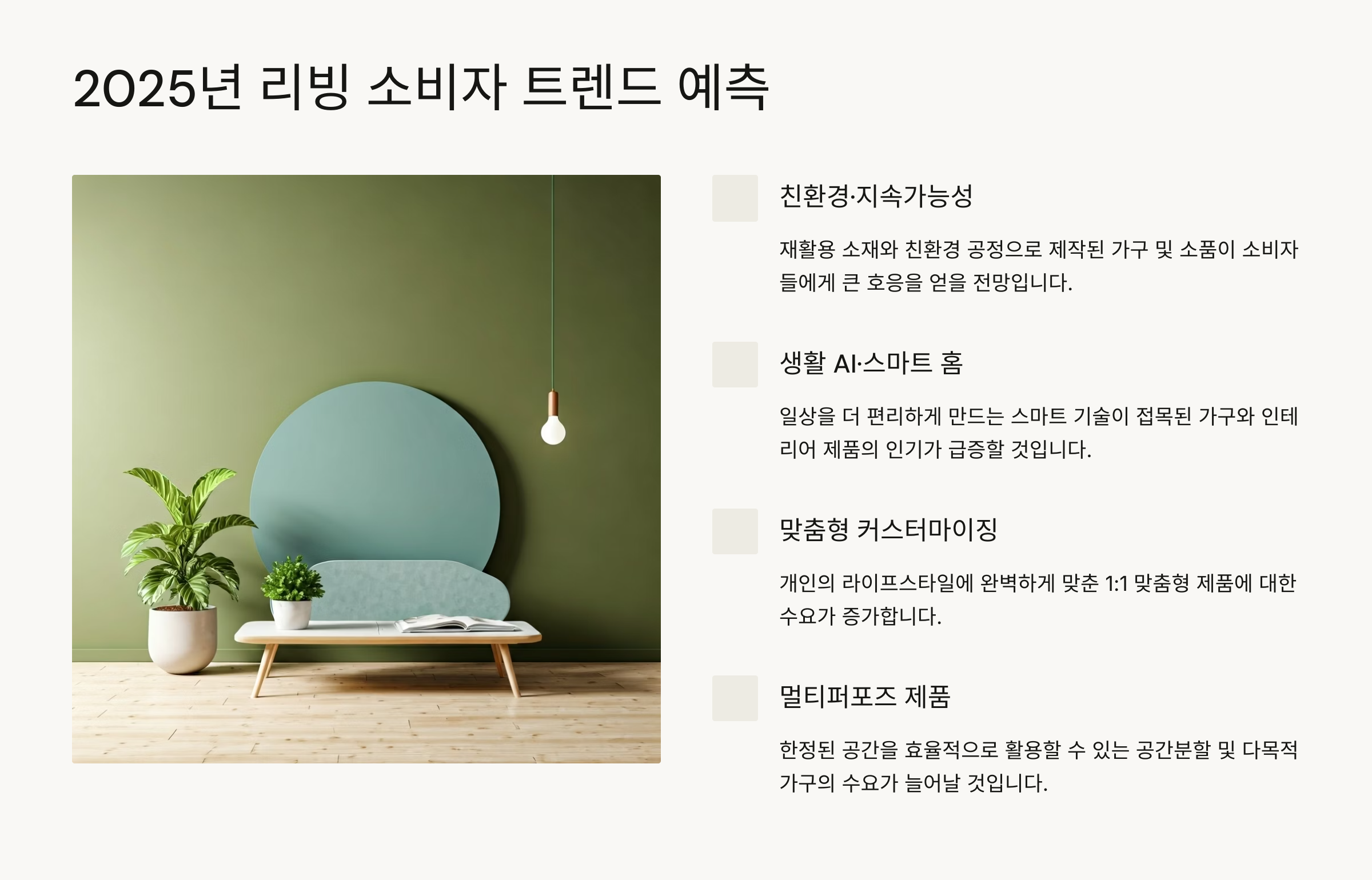 | 개인 맞춤형 인테리어 | 취향에 따라 조합하는 모듈형 가구, 색감 스타일링 | 모듈소파, DIY 테이블 |