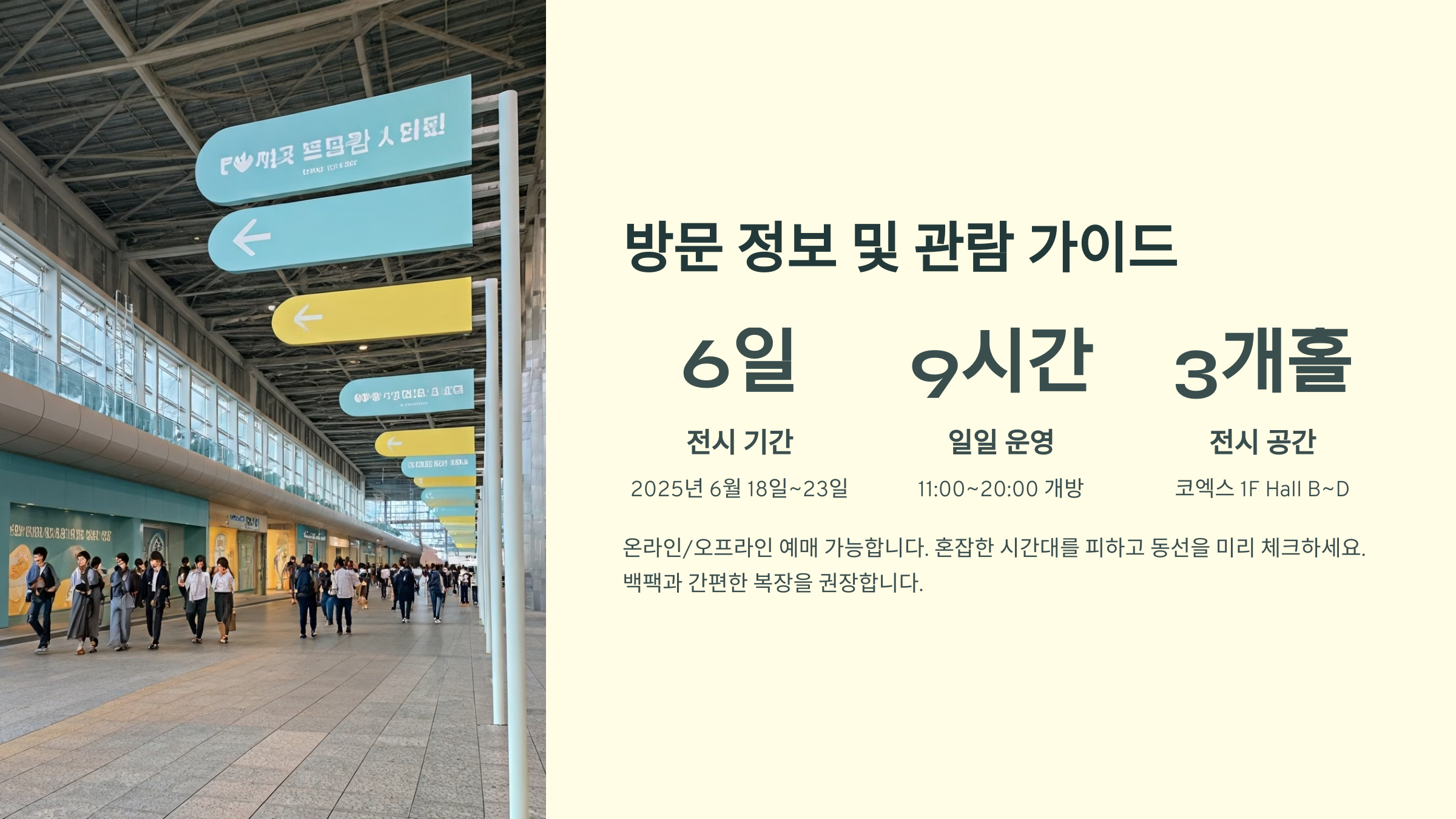 🎯 결국 이번 도서전은 단순히 책을 읽는 문화에서 ‘책을 통해 연결되고 소통하는’ 문화로 확장되고 있어요. 책의 매개로 창작, 소비, 유통이 다시 재정의되고 있는 시대에, 2025 서울국제도서전은 그 흐름을 가장 잘 보여주는 대표적인 무대예요.🔥