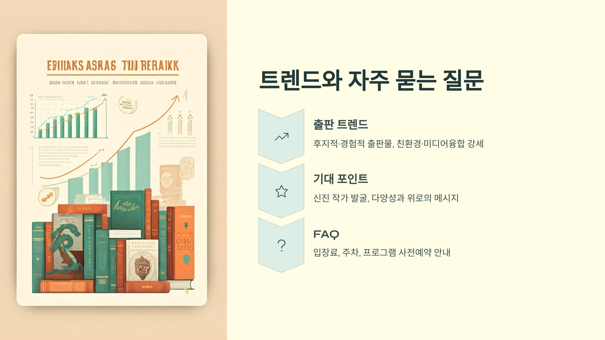 🎤 작가와 직접 대화할 수 있는 ‘북사인회’와 ‘1:1 작가상담’도 큰 인기를 끌 전망이에요. SNS 이벤트로 당첨된 관람객은 작가와 오붓하게 책 이야기를 나눌 수 있는 기회까지 있어요. 이런 생생한 경험은 일반적인 도서관이나 서점에선 쉽게 얻기 어렵죠.