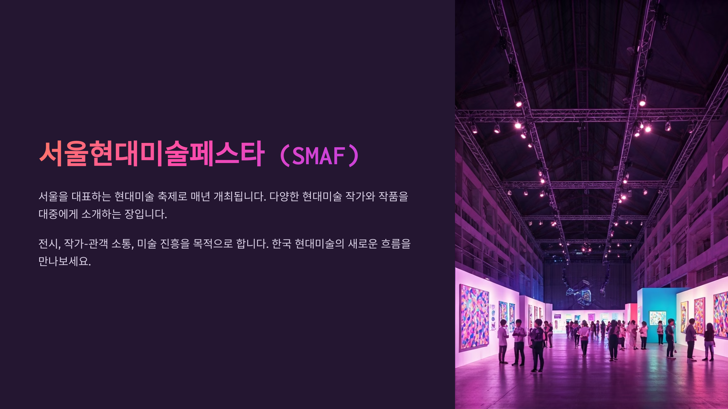 서울현대미술페스타(SMAF)는 13회를 맞이한 국내 대표 현대미술 전시회로, 신진 작가부터 중견 작가까지 다양한 예술가들이 참여하는 대형 페스타예요. 이 전시는 단순한 작품 전시회를 넘어, 직접 소통과 예술 시장 진출을 위한 기회를 제공하는 플랫폼 역할까지 하고 있답니다.
