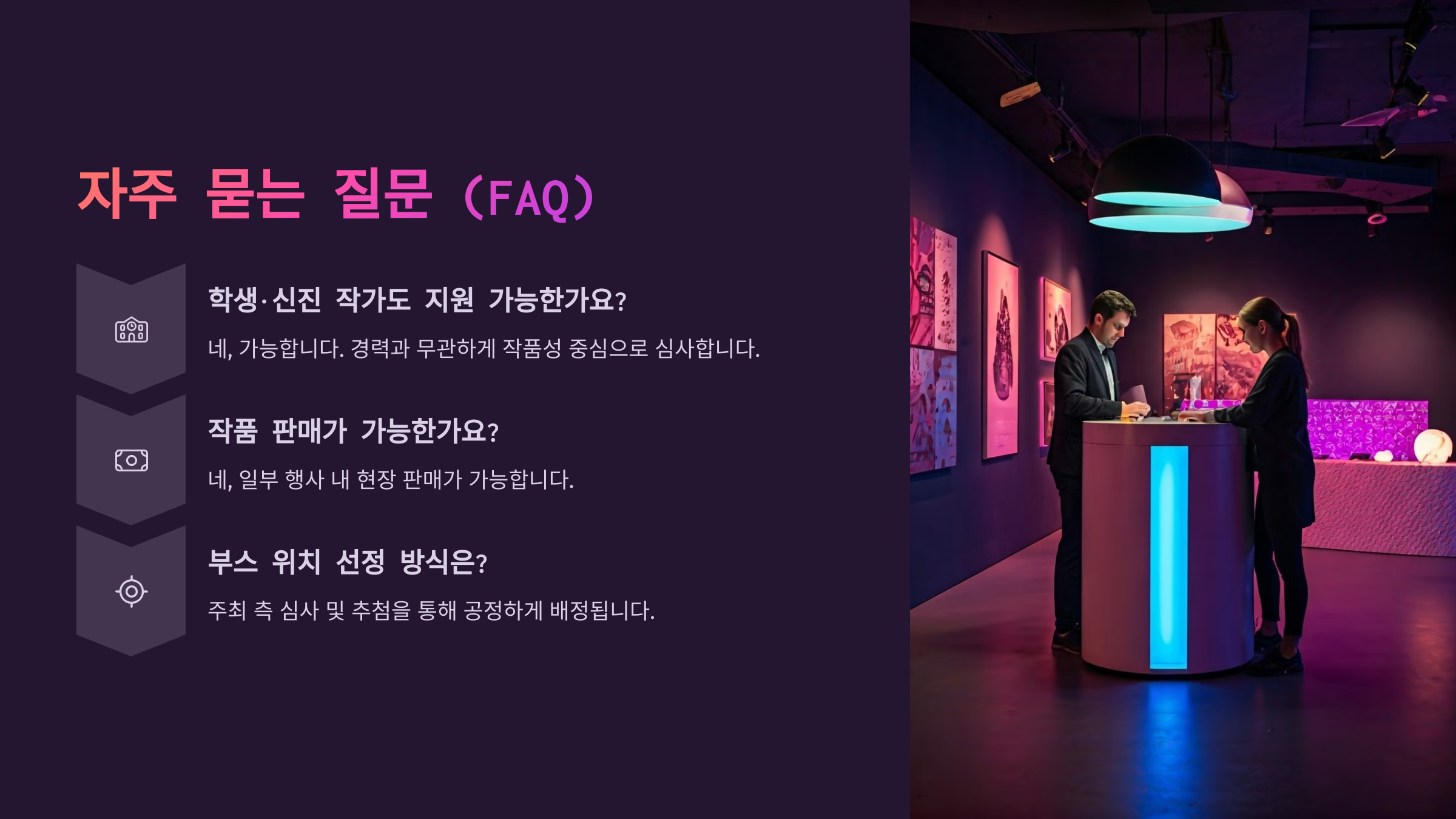 A1. 아니에요! 미술 전공 여부는 필수 기준이 아니에요. 작품성과 역량이 인정된다면 누구나 참가 가능해요. 실제로 비전공 작가분들도 매년 다수 참가하고 있어요.