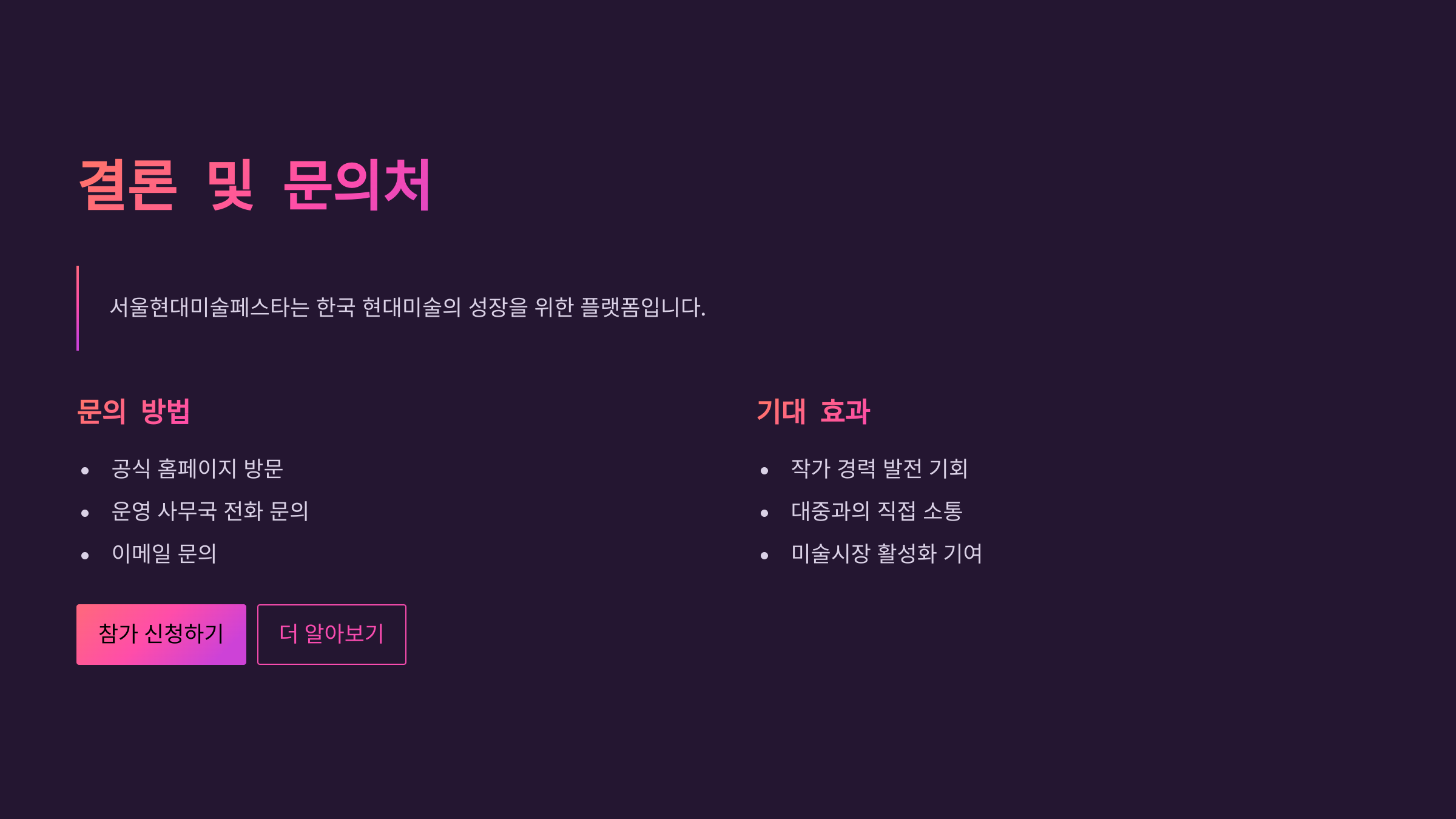 이번 서울현대미술페스타는 작가와 관람객 모두에게 잊지 못할 예술의 장이 될 거예요. 정확한 일정과 구조를 알고 미리 준비하면 훨씬 여유 있고 의미 있는 전시가 가능하답니다.🎉