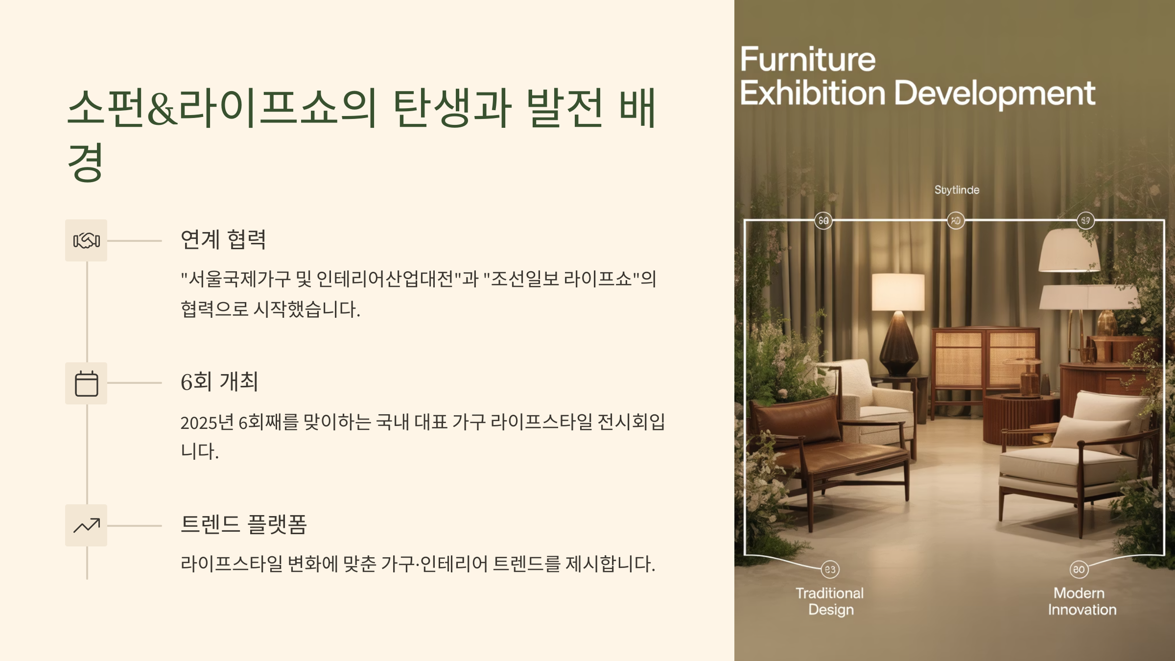 소펀&라이프쇼는 단순한 가구 전시를 넘어서 ‘생활과 디자인의 융합’을 제안하는 국내 대표적인 전시회예요. 이 전시회는 2017년을 시작으로 매년 정기적으로 개최되며, 가구와 인테리어 산업의 성장에 맞춰 규모도 함께 커지고 있어요. 특히 소파를 중심으로 다양한 리빙 아이템을 소개하는 독보적인 콘셉트로 자리 잡았답니다.