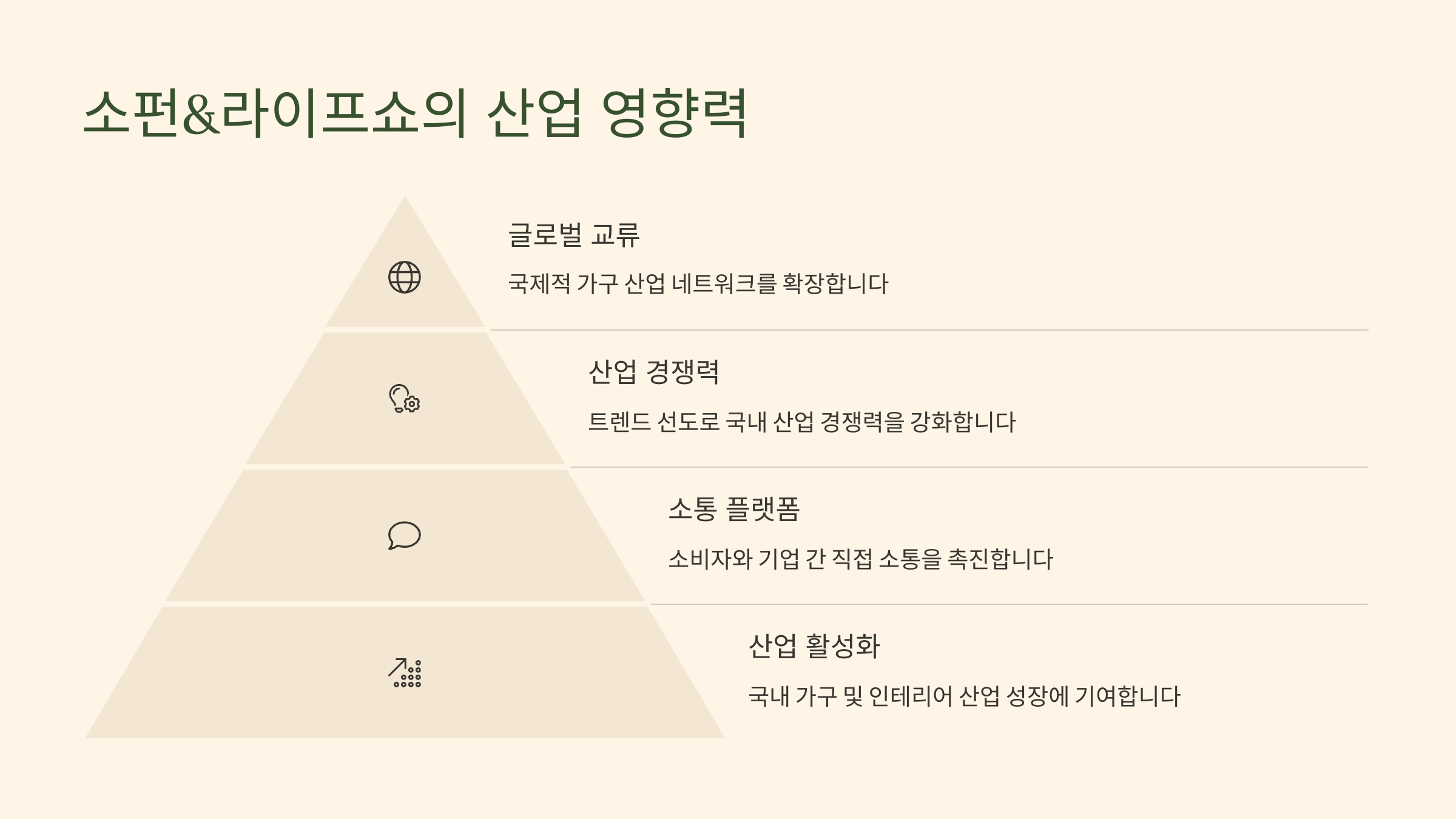 소펀&라이프쇼는 단순한 소비자 체험 중심 박람회를 넘어, 가구·인테리어 산업 전반에 실질적인 영향을 주는 전시회로 자리매김하고 있어요. 국내에서 유일하게 '소파' 중심 가구 전문 전시로 시작된 이 행사는 현재 ‘토털 홈 리빙 전시회’로 진화했어요. 이 전시가 열릴 때마다 브랜드 전략과 제품 개발 방향이 눈에 띄게 달라지는 이유도 여기에 있어요.
