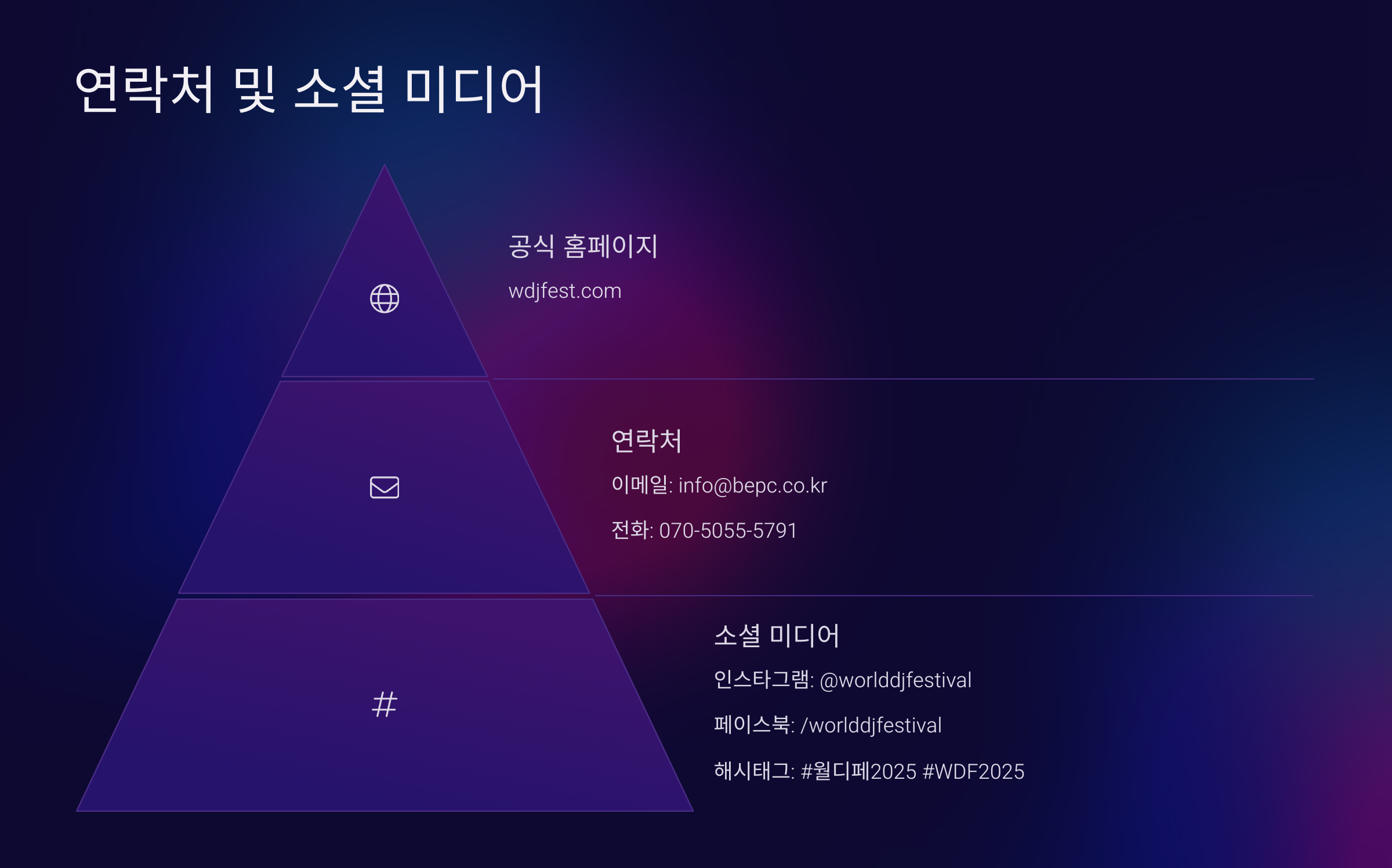 2025 월드 DJ 페스티벌은 음악만 즐기는 축제가 아니에요! 이틀간 펼쳐지는 다채로운 프로그램과 부대행사는 페스티벌을 더욱 풍성하게 만들어줘요. 메인 공연 외에도 체험형 이벤트, 예술 전시, 푸드트럭 페스티벌, EDM 굿즈 마켓 등 정말 다양하게 준비되어 있답니다. 음악 팬뿐만 아니라 문화와 감각적인 공간을 즐기는 이들에게도 완벽한 시간이 될 거예요.