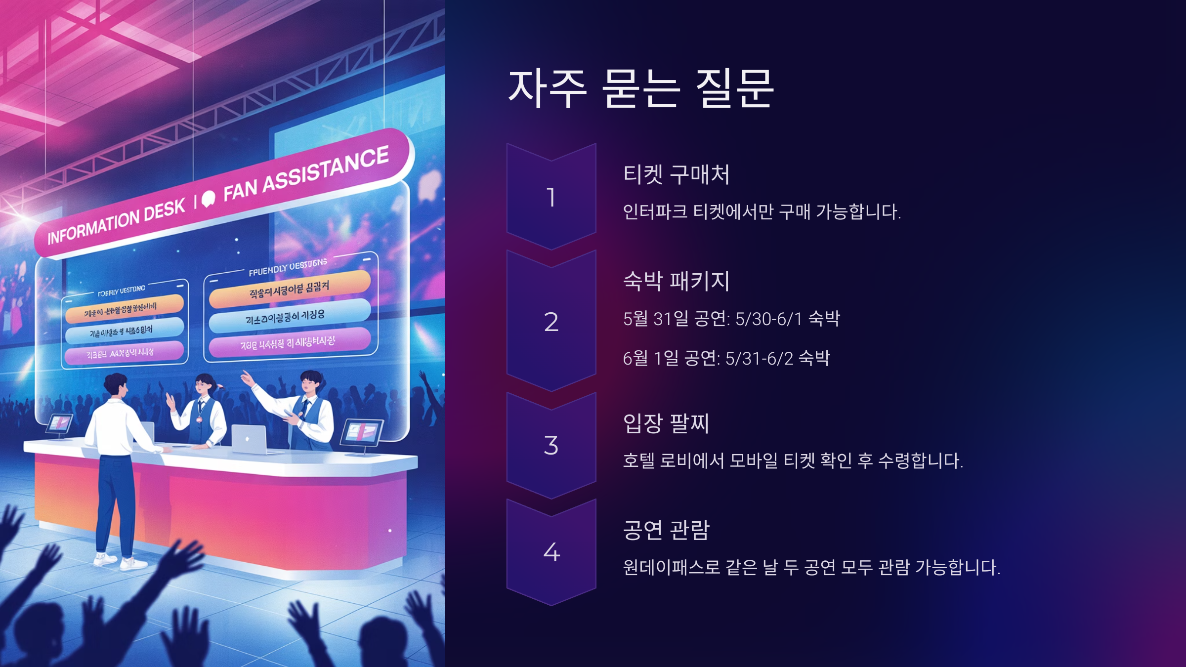 행사 시간은 매일 오전 11시부터 밤 10시까지예요. 낮에는 아티스트와 팬이 직접 소통할 수 있는 팬 이벤트, Q&A, 포토존이 운영되고, 저녁엔 본격적인 공연이 펼쳐져요. 티켓 소지자에 한해 체험존, 굿즈샵, 아티스트 참여 프로그램 입장이 가능하니까, 미리 티켓 예매는 필수예요. 이번 페스티벌은 전 구역이 QR 기반으로 운영돼서 입장도 스마트하게 관리된다고 해요. 📱