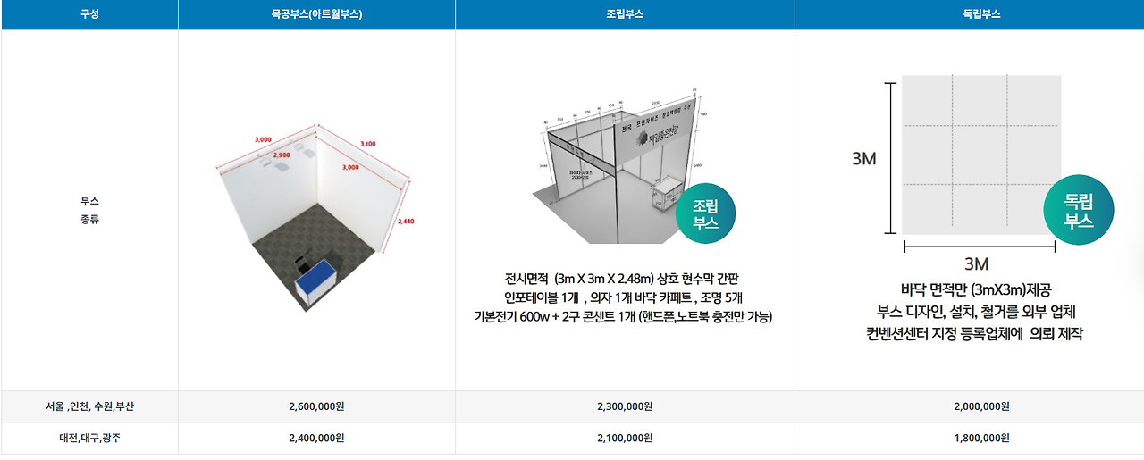 | 독립부스 | 3m × 3m 이상 | 전시 공간만 제공 (직접 시공) | 180만원 |