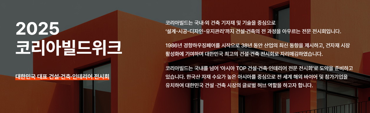 1986년부터 이어진 코리아빌드 전통을 기반으로, 2025년에는 더 확장된 규모와 구성으로 코엑스 전관에서 개최되며, 건설 산업의 글로벌 트렌드와 국내 수요를 동시에 만족시킬 전시회로 기대를 모으고 있어요. 그럼 본격적으로 전시회에 대해 자세히 알아볼까요? 😊