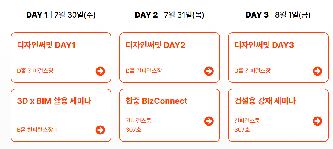 같은 기간에 열리는 부대 전시회로는 '코리아빌드', '넥스트건설기계전', '경기기술융합관', '월드디자인페어' 등 총 4개 테마의 전시가 함께 진행되어서 건설 산업 전반을 한 자리에서 모두 확인할 수 있어요.