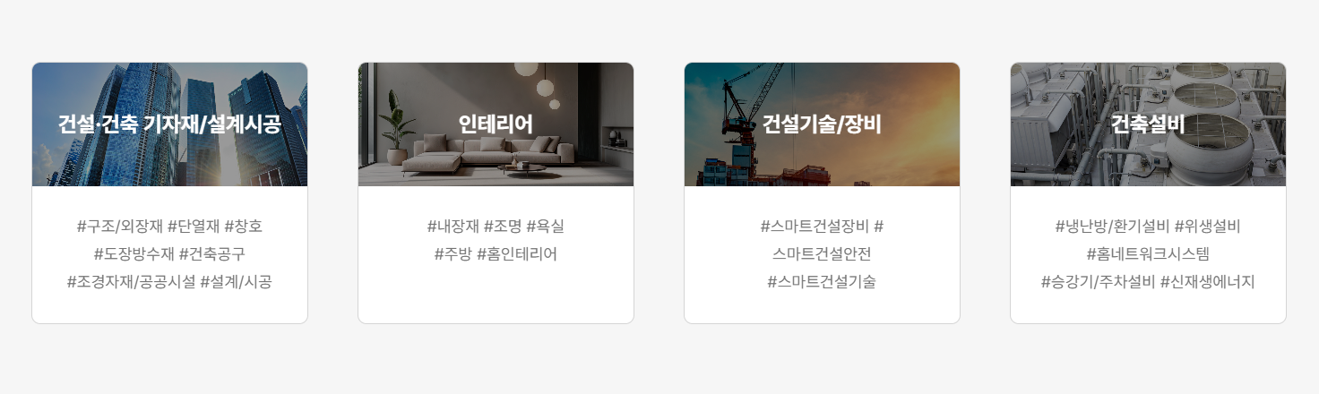 | 건설·건축 기자재 | 구조재, 창호, 단열재, 도장방수재, 조경자재 |