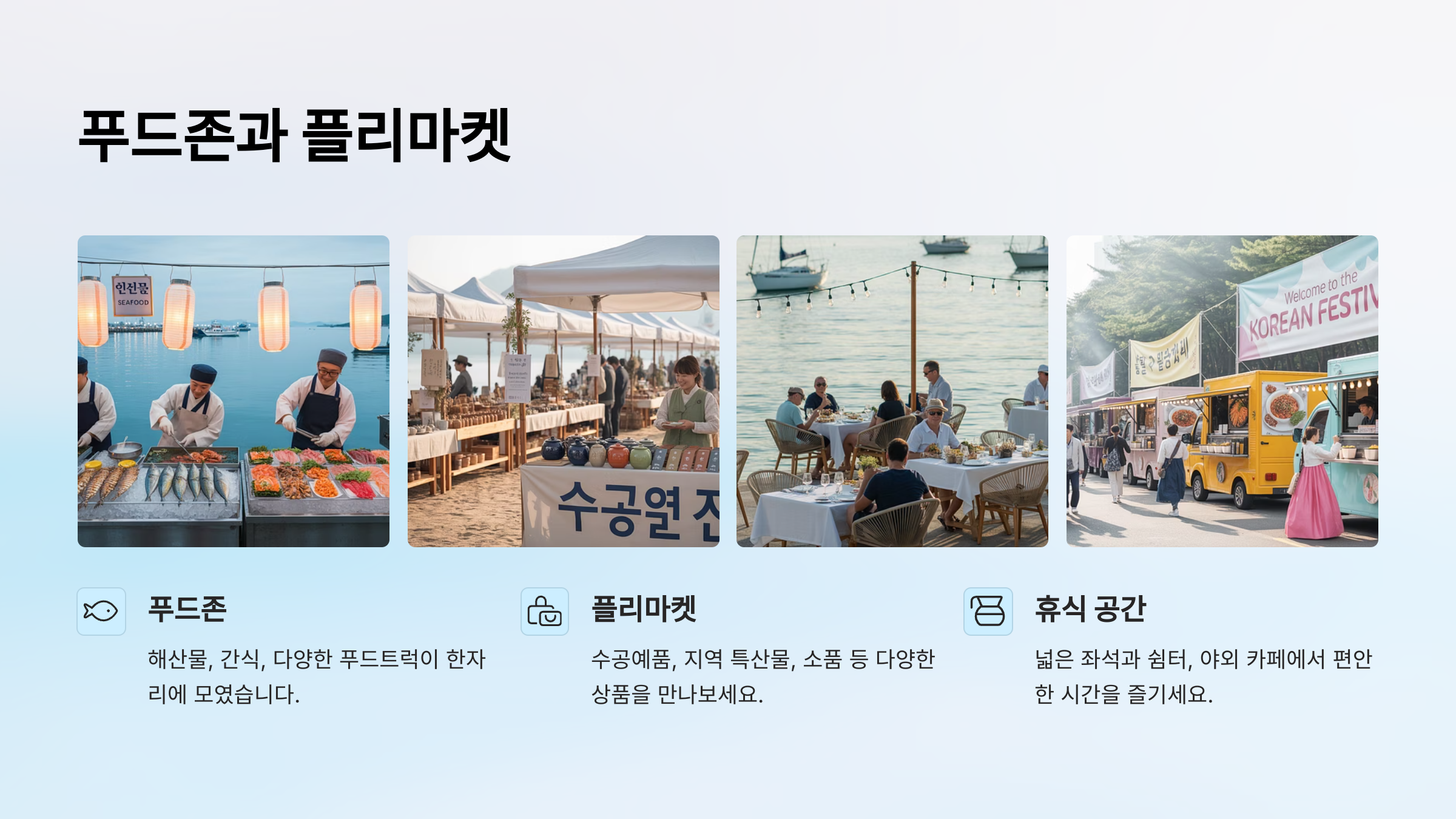 | 플리마켓 | 수공예, 캔들, 바다 테마 상품 | 체험 가능 부스 포함 |