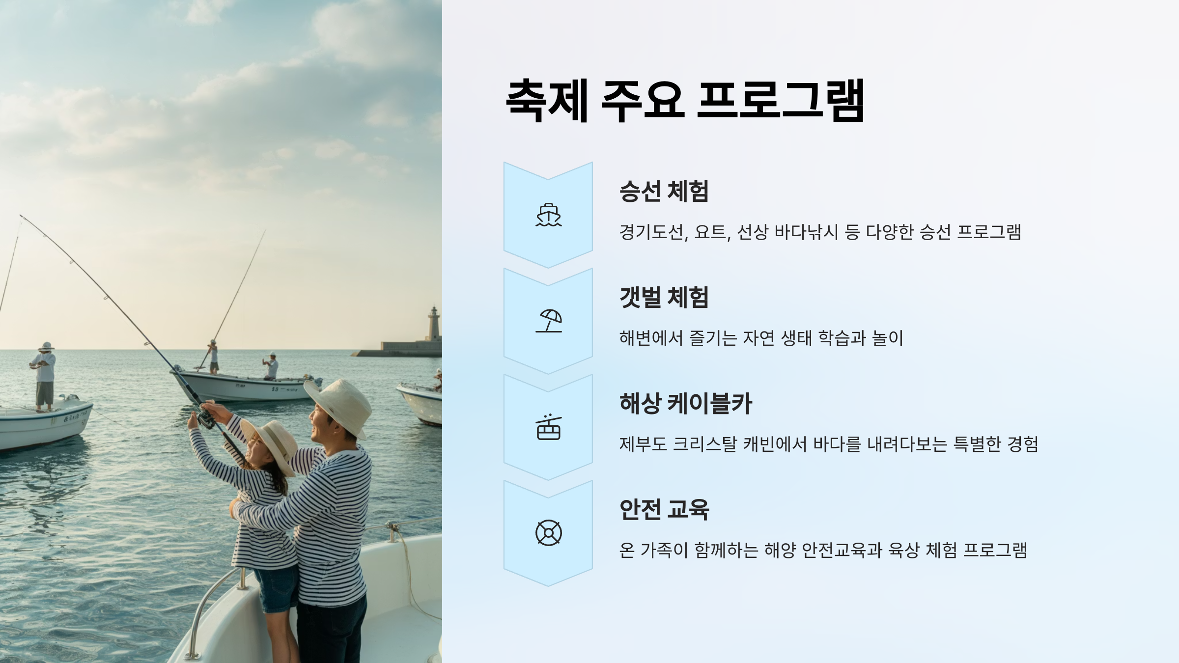 뿐만 아니라 지역의 전통 해양 문화를 알릴 수 있는 기회도 되어요. 해녀 문화, 전통 어업 방식, 그리고 바다와 관련된 민속놀이 체험까지 다채로운 경험을 제공하고 있어요.