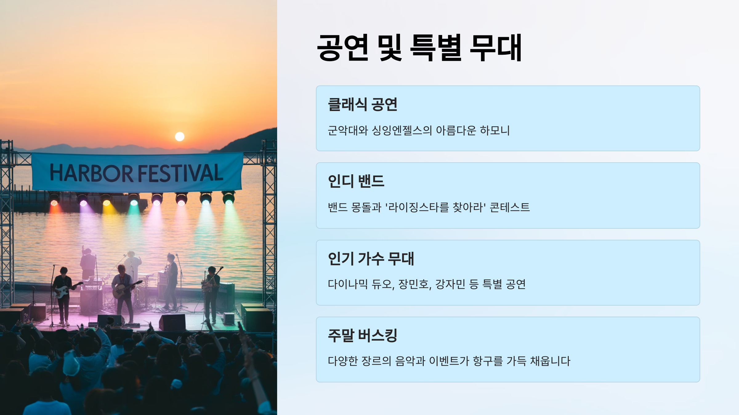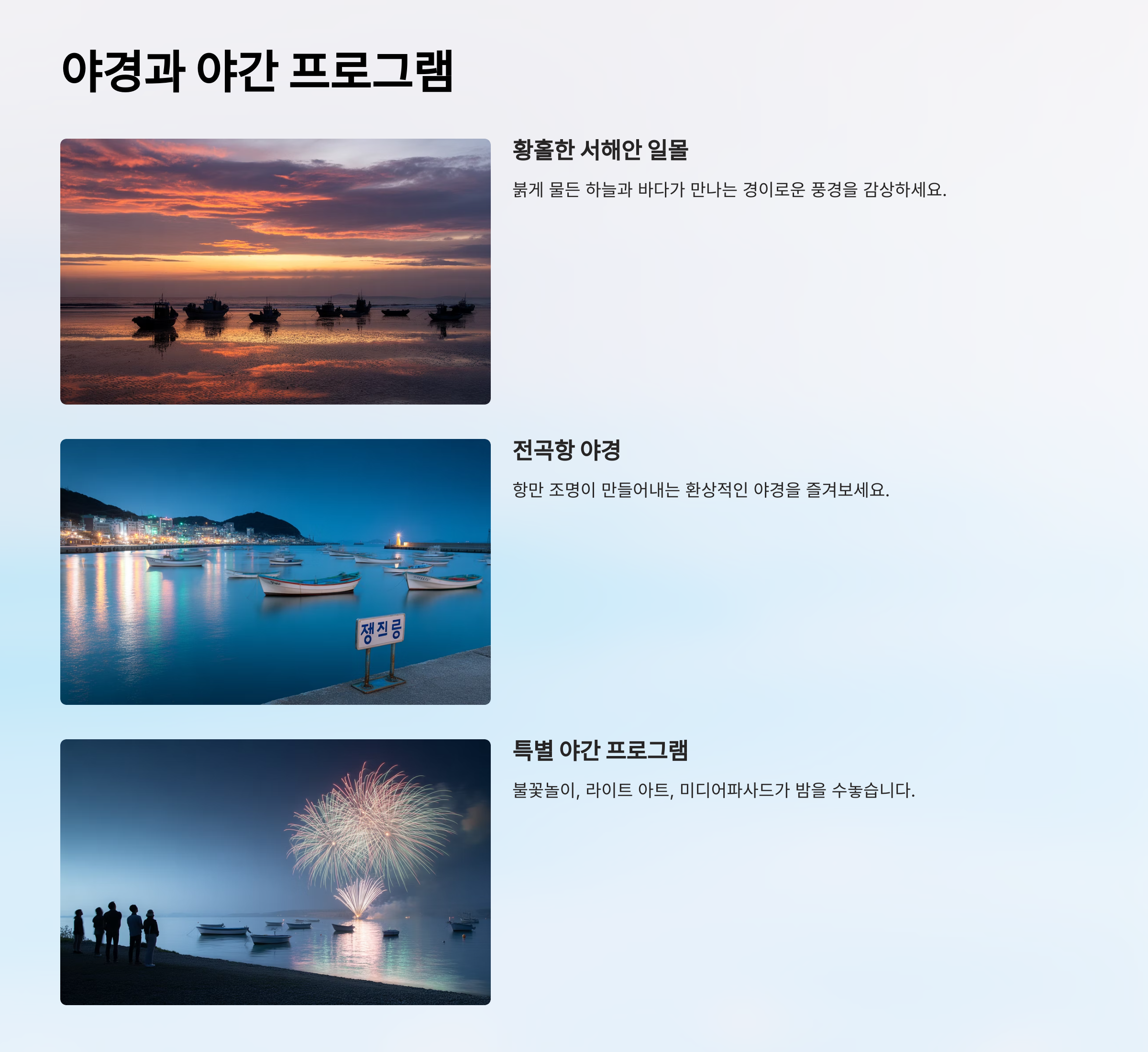 밤에 펼쳐지는 이 환상적인 프로그램들은 하루 종일 축제장을 떠나지 못하게 만들 만큼 매력적이에요. 연인과 함께, 가족과 함께, 친구와 함께 전곡항의 밤을 꼭 즐겨보세요.