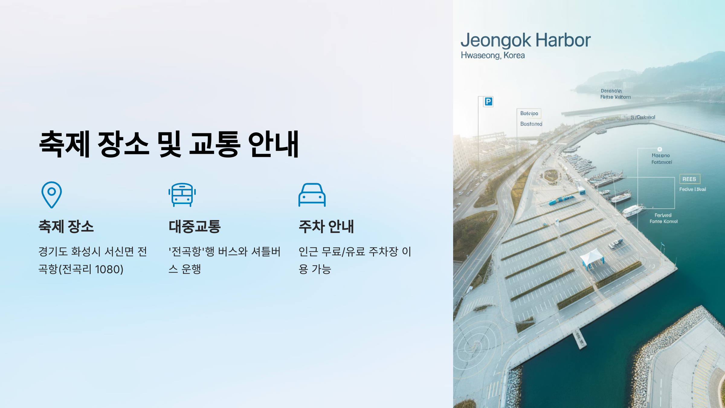 대중교통을 이용할 경우, 서울에서는 수원역 또는 송탄역에서 시외버스를 타고 서신터미널로 이동한 뒤, 셔틀버스를 타고 전곡항으로 갈 수 있어요. 화성시에서는 축제 기간 동안 전곡항행 셔틀버스를 무료로 운행해서 접근성을 높이고 있어요. 주차 공간도 넉넉하게 마련돼 있어서 자차 이용도 부담 없어요.