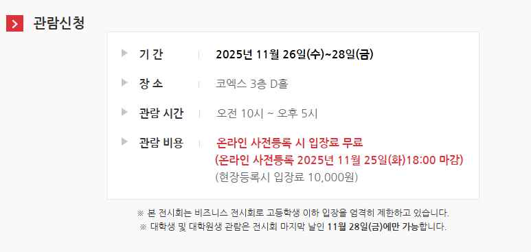 전시 관람 시간은 오전 10시부터 오후 5시까지예요. 행사장 입장은 사전 등록 시 무료이며, 현장 등록의 경우 1만 원 입장료가 부과된답니다. 학생은 11월 28일(금) 하루만 입장 가능하다는 점도 참고해 주세요.