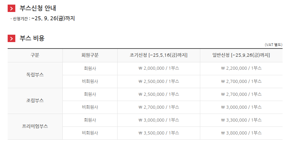 2025년 9월 26일(금)까지 신청 가능하며, 조기 신청 시 최대 500,000원까지 할인 혜택이 있어요. 조립부스는 간단한 전시가 필요한 스타트업에 적합하고, 독립부스는 대형 장비 전시가 가능한 형태예요.