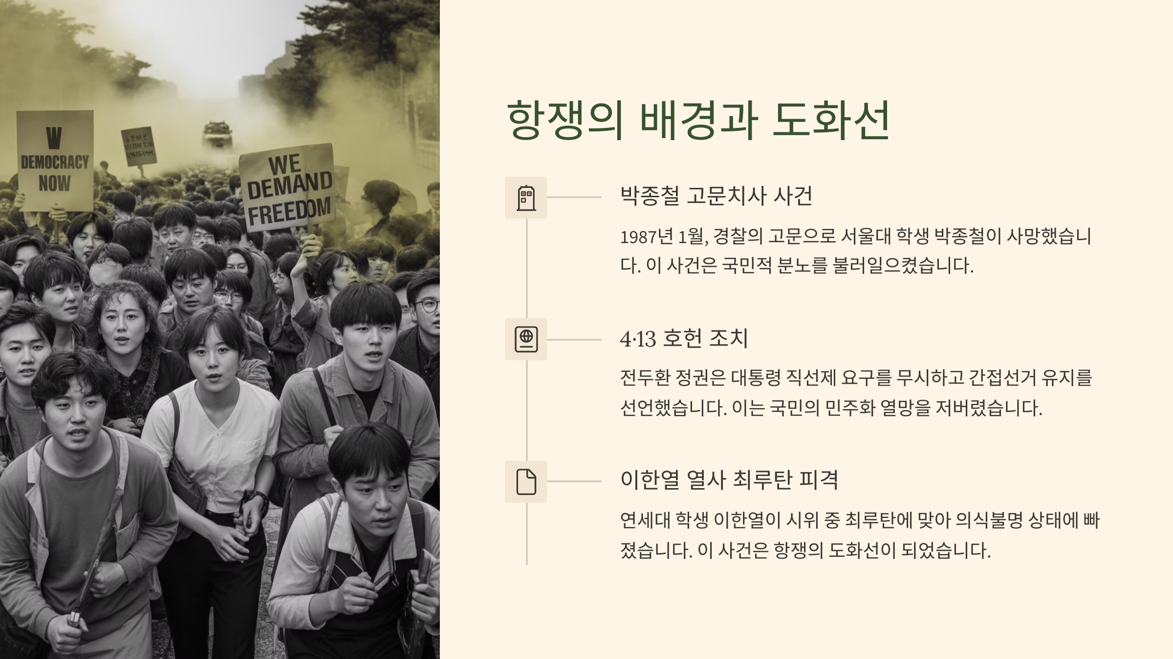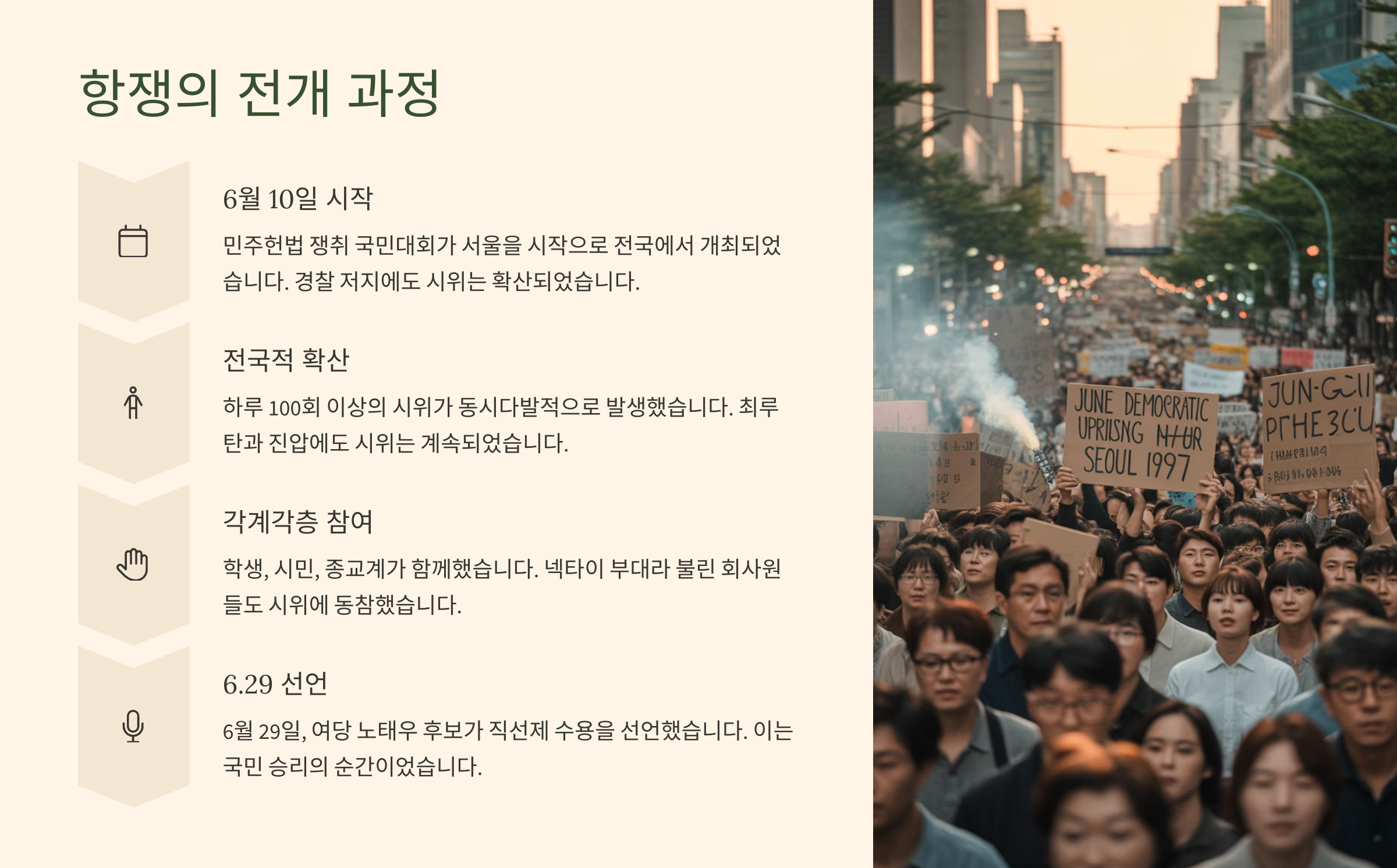 이렇게 다양한 배경들이 겹치면서 1987년 6월, 결국 전국적 규모의 항쟁이 폭발하게 된 거예요. 이 항쟁은 단지 정치권만의 싸움이 아닌, 시민 모두의 삶과 직결된 싸움이었기 때문에 더 뜨거운 에너지를 가졌어요.
