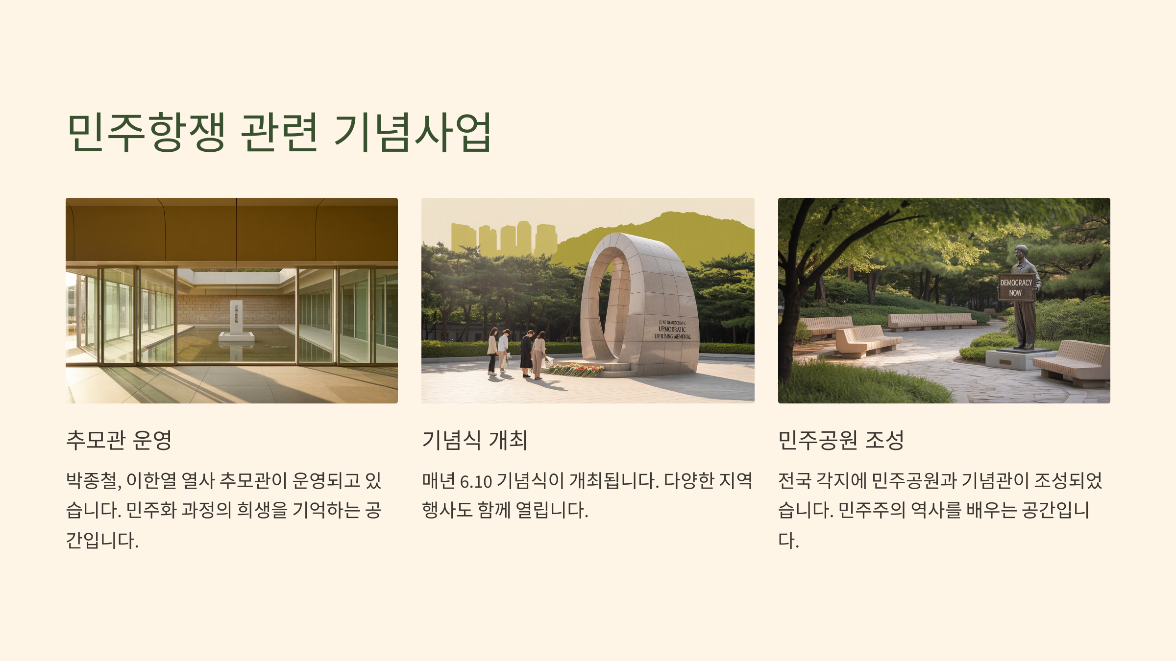 기념사업의 중심엔 ‘사람’이 있어요. 매년 6월이 되면 그날의 현장에 있었던 시민, 학생, 유가족들이 모여 당시의 이야기를 나누고 서로를 위로해요. 구술기록사업도 활발히 이뤄지고 있어서, 당시 참여자들의 목소리를 생생히 기록해 후대에 전하고 있어요. 이건 단순한 역사 기술이 아니라, 살아있는 민주주의 교육이에요.